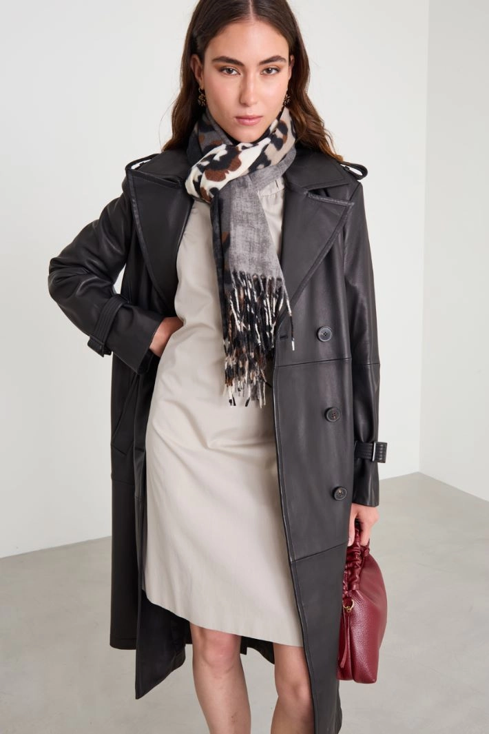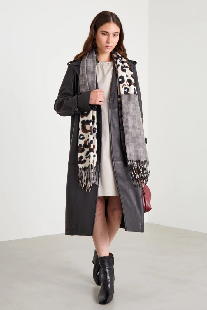 Scarf in lightweight animal print cloth, with fringes at the bottom.