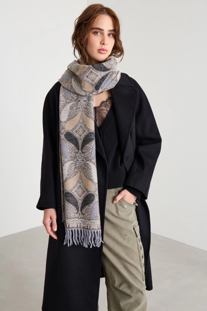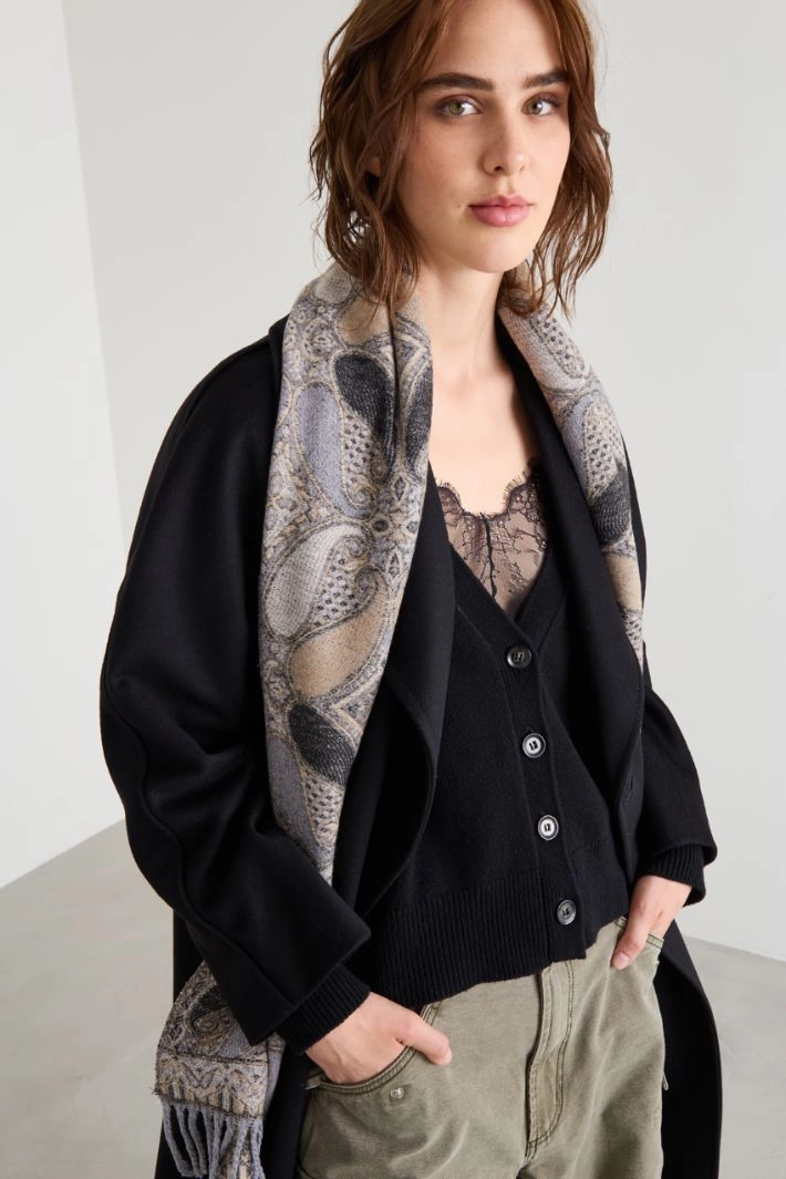 Stole in soft jacquard fabric, with fringes at the bottom.