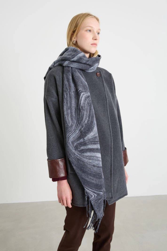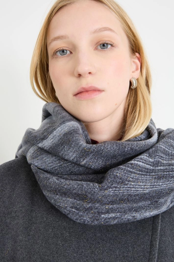 Scarf in patterned yarn, with lamé fibre insert and fringes at the bottom.