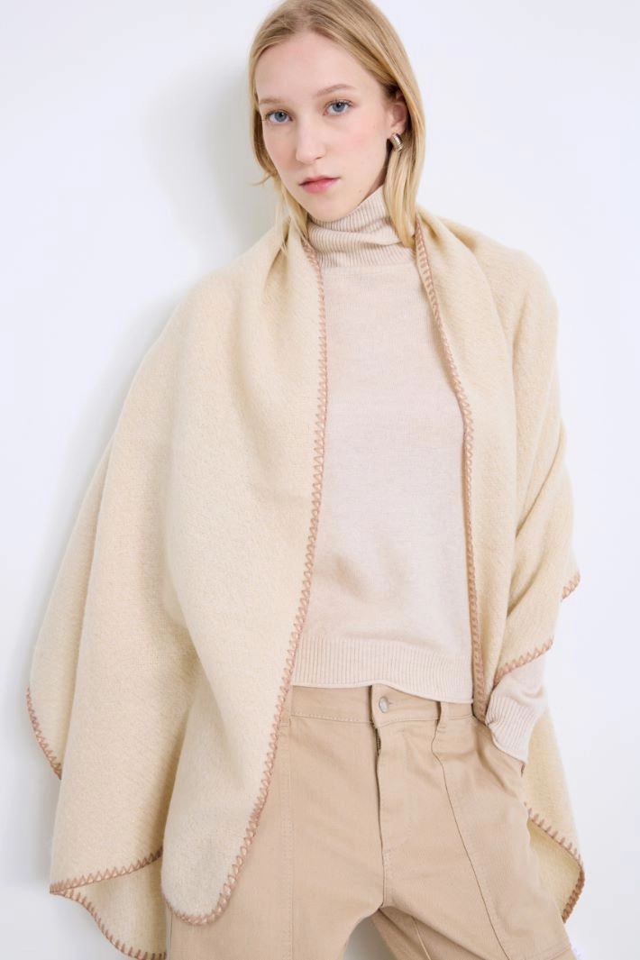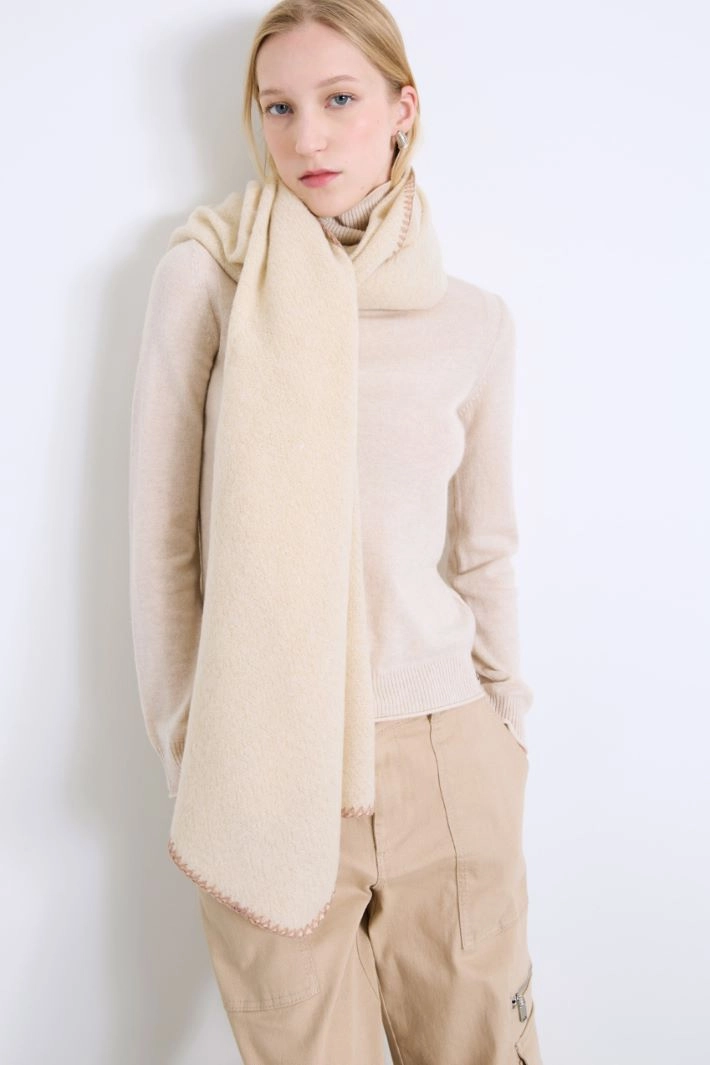 Stole in yarn-dyed fabric, with lamé fibre insert and crochet-finished profiles.