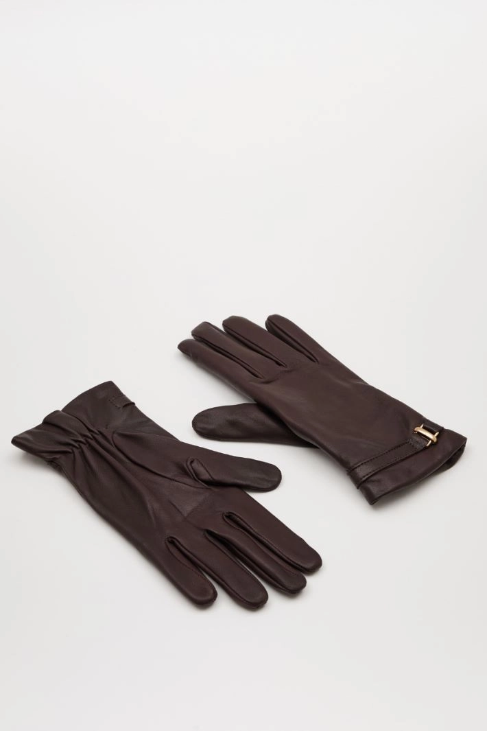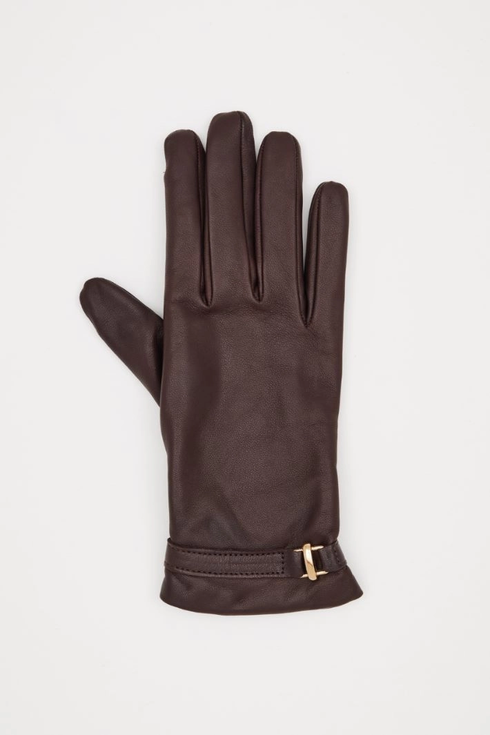 Leather gloves with wrist strap detail, wool lining.
