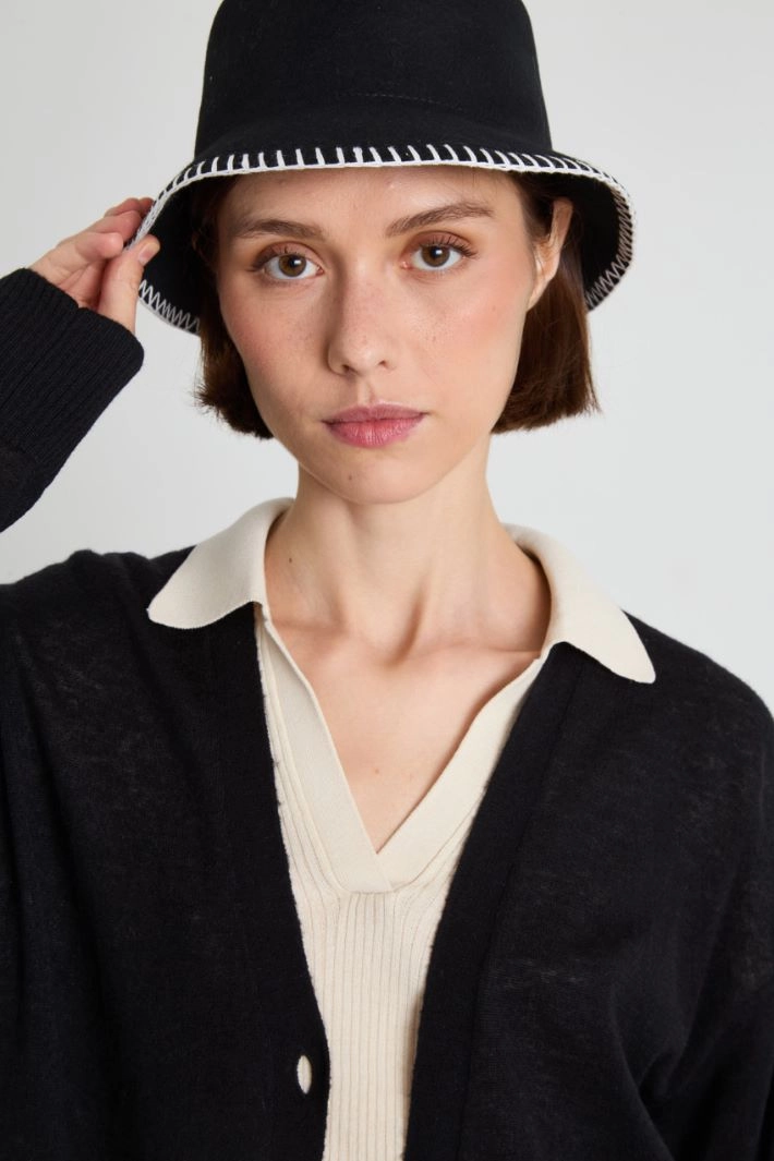 Fabric 100% wool; swearband 65% cotton, 35% polyester.