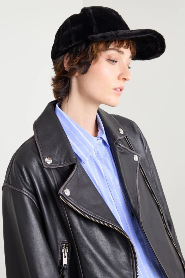 Baseball cap in plush-effect fabric, with rigid visor and adjustable strap on the back.