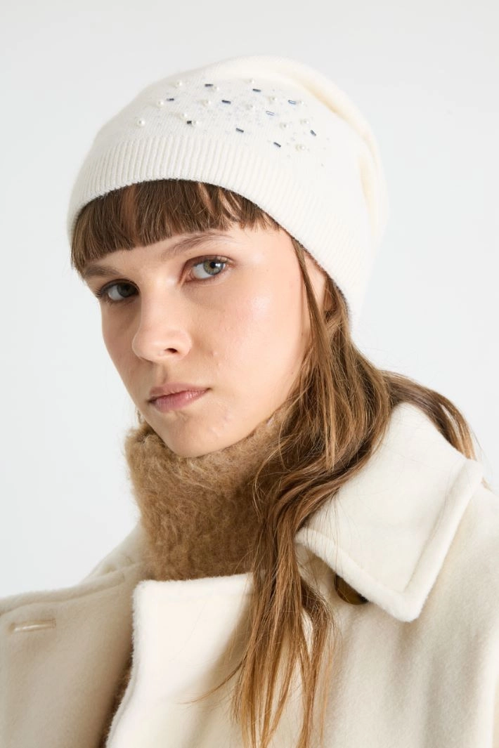 Beanie hat in viscose blend knit with applied rhinestone motif.