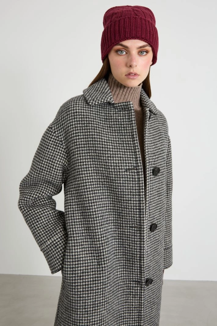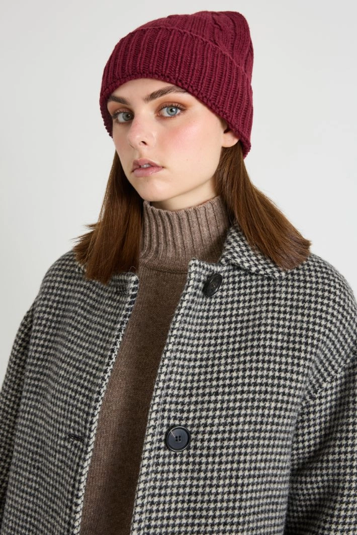 Hat in wool, viscose and cashmere, with cable knit and turn-up hem.