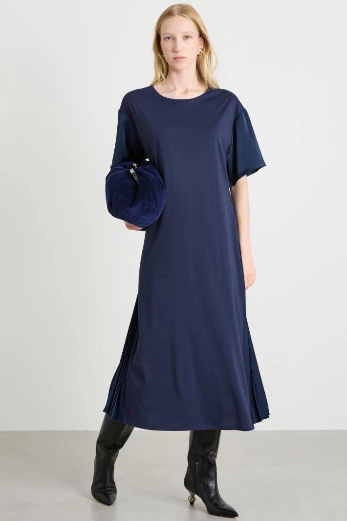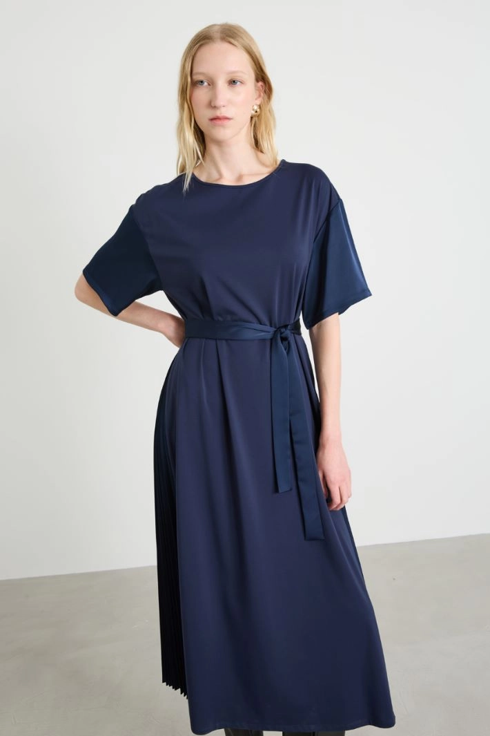 Flared dress in a jersey blend of natural fibers and stretch viscose, with pleated satin inserts on the sides and smooth satin sleeves. Model with round neckline and short sleeves. Matching sash.