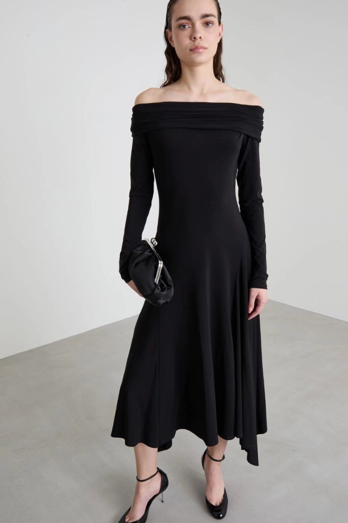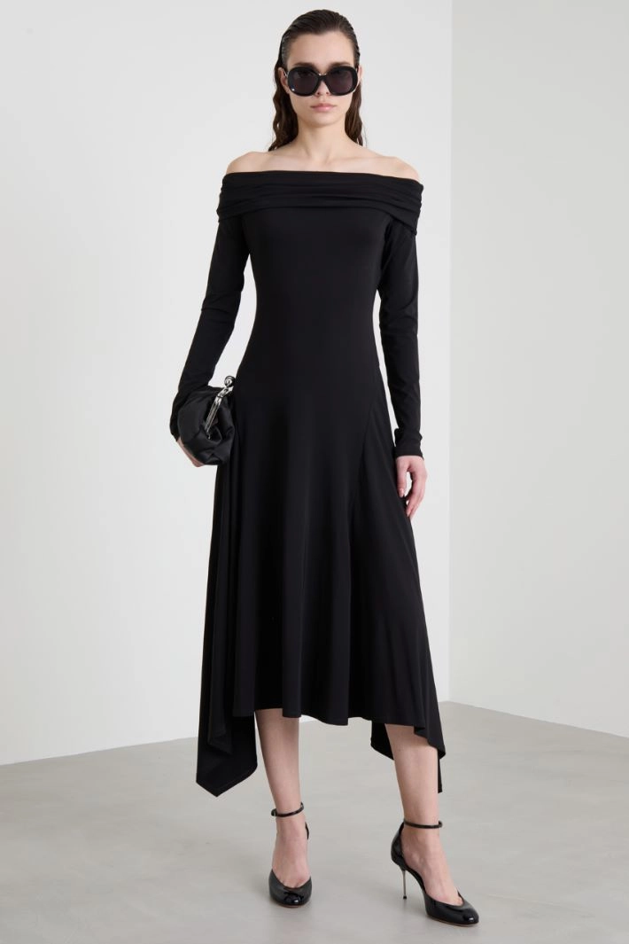 Fitted dress in stretch viscose jersey, with off-the-shoulder neck, long sleeves and asymmetrical hem. Semi-lined..