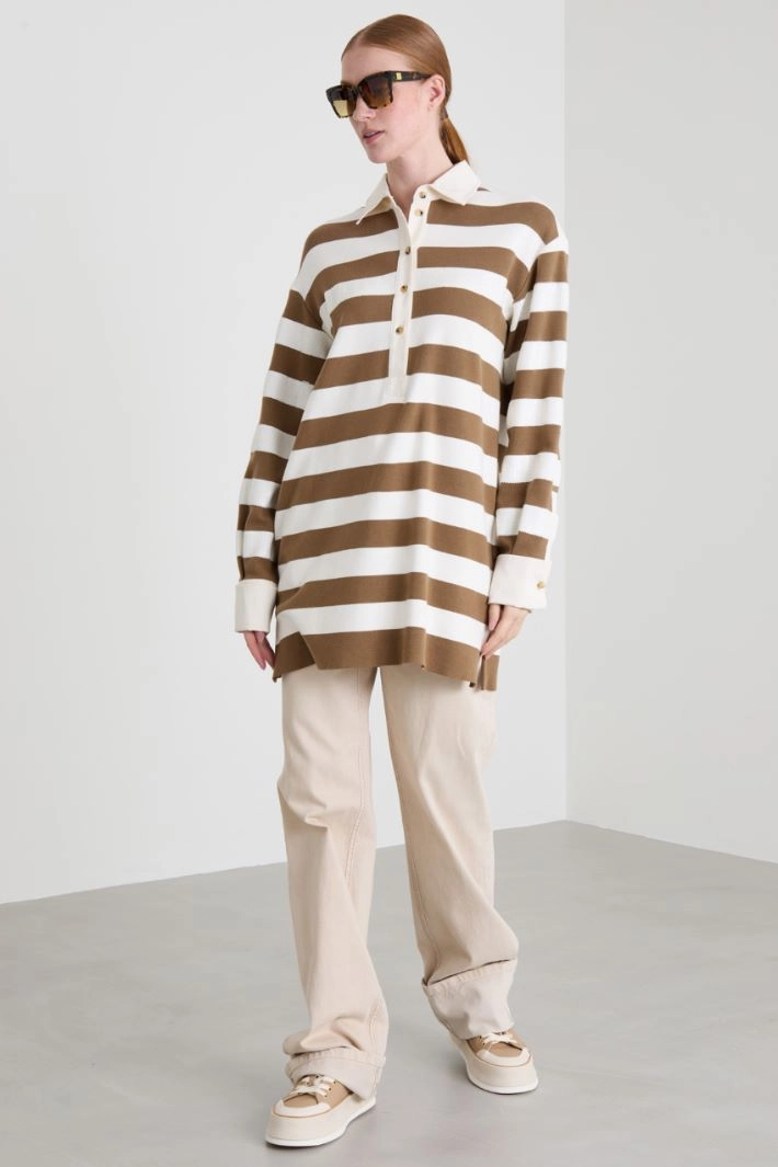 Straight-cut dress in pure cotton jersey, with satin details and embroidered sequins, classic collar, long sleeves with cuff and cufflink. Button fastening.