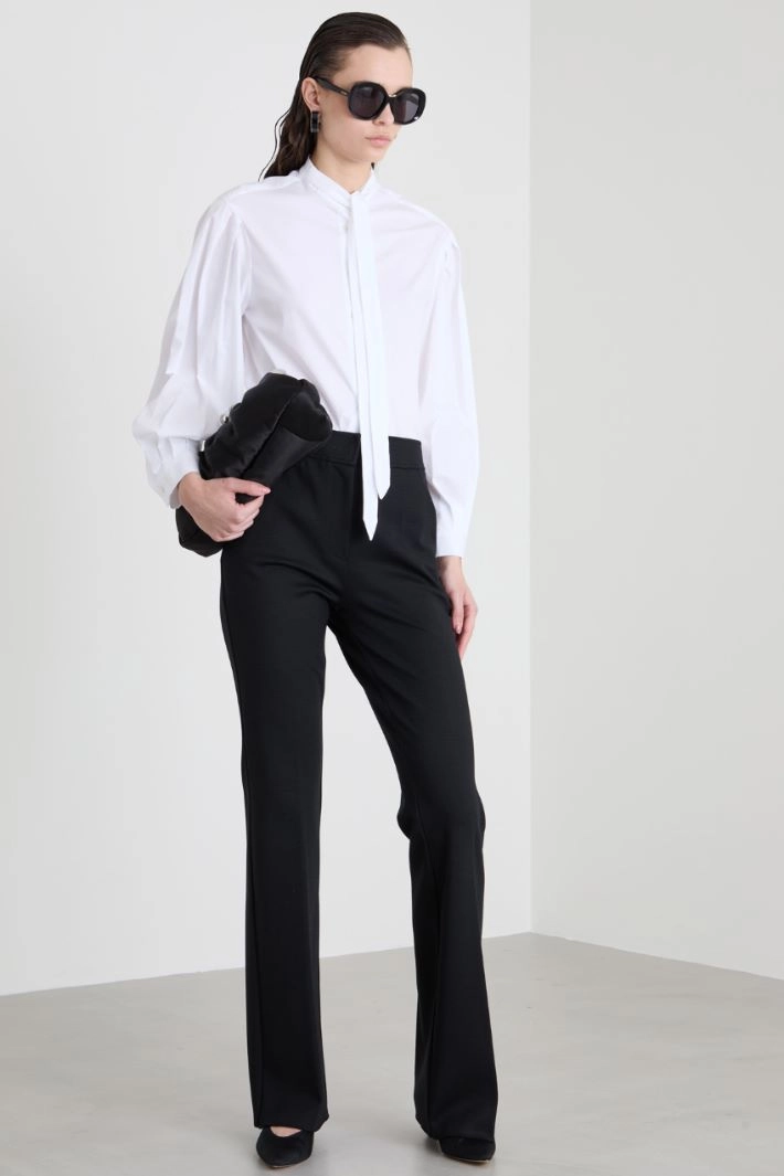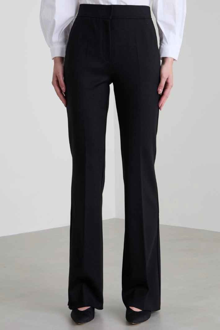 Straight-fit trousers in double jersey stretch wool blend, with French side pockets, crease along the length and hidden fastening with zip, button and hooks.