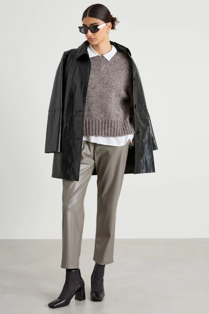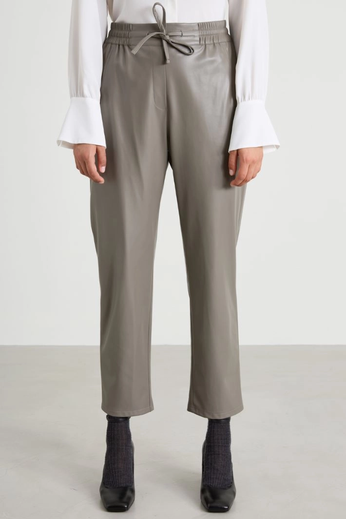 Jogger trousers in faux leather coated jersey, with drawstring waist, French side pockets and welt pockets on the back.