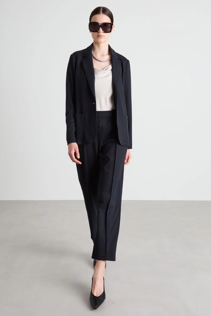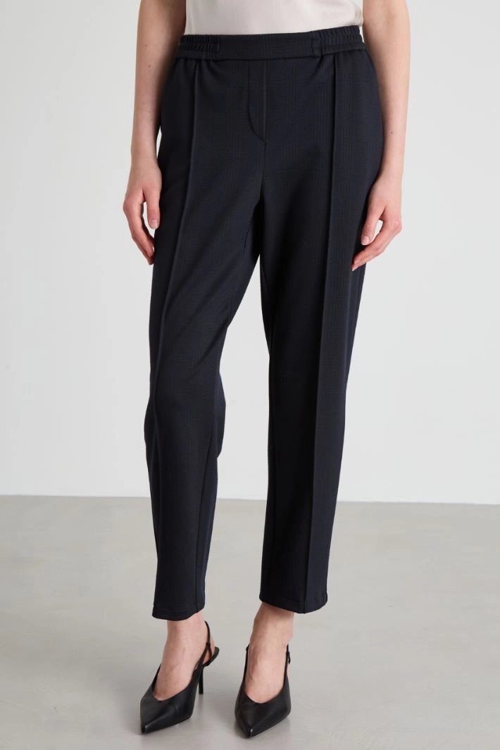 Cigarette trousers in stretch viscose blend jacquard jersey, with elasticated waistband, inset side pockets and pleat sewn along the length.