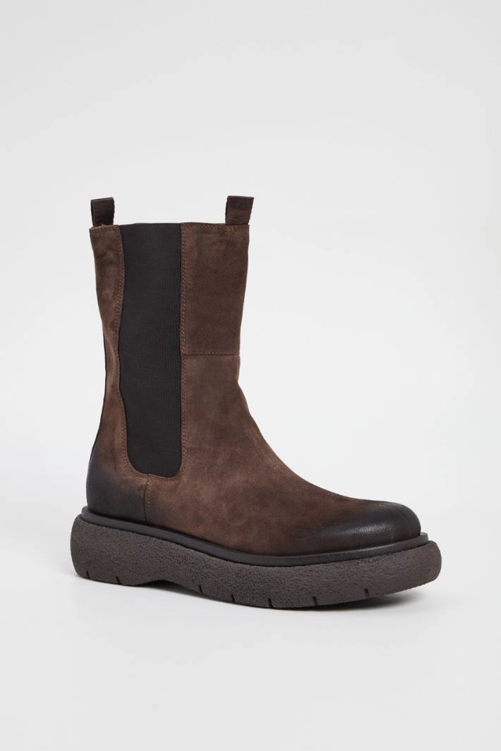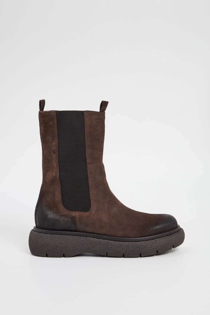 Ankle boots in genuine leather with elastic inserts on the sides and chunky rubber sole.