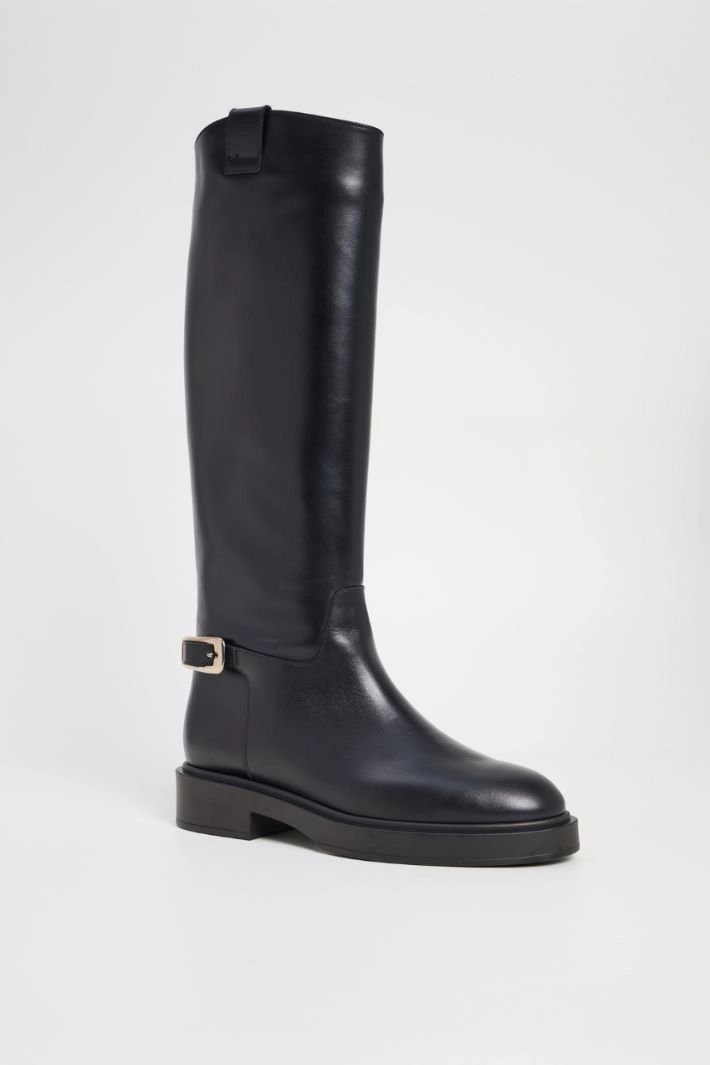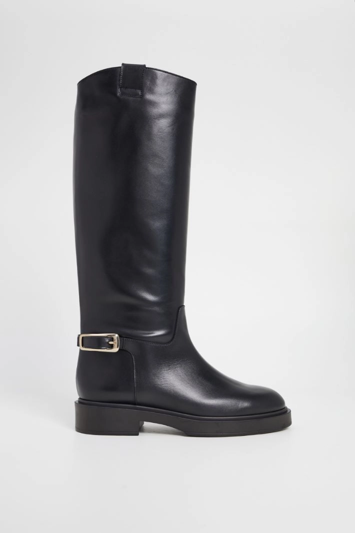 Boots in genuine leather, with ankle buckle detail and rounded toe. Rubber sole.