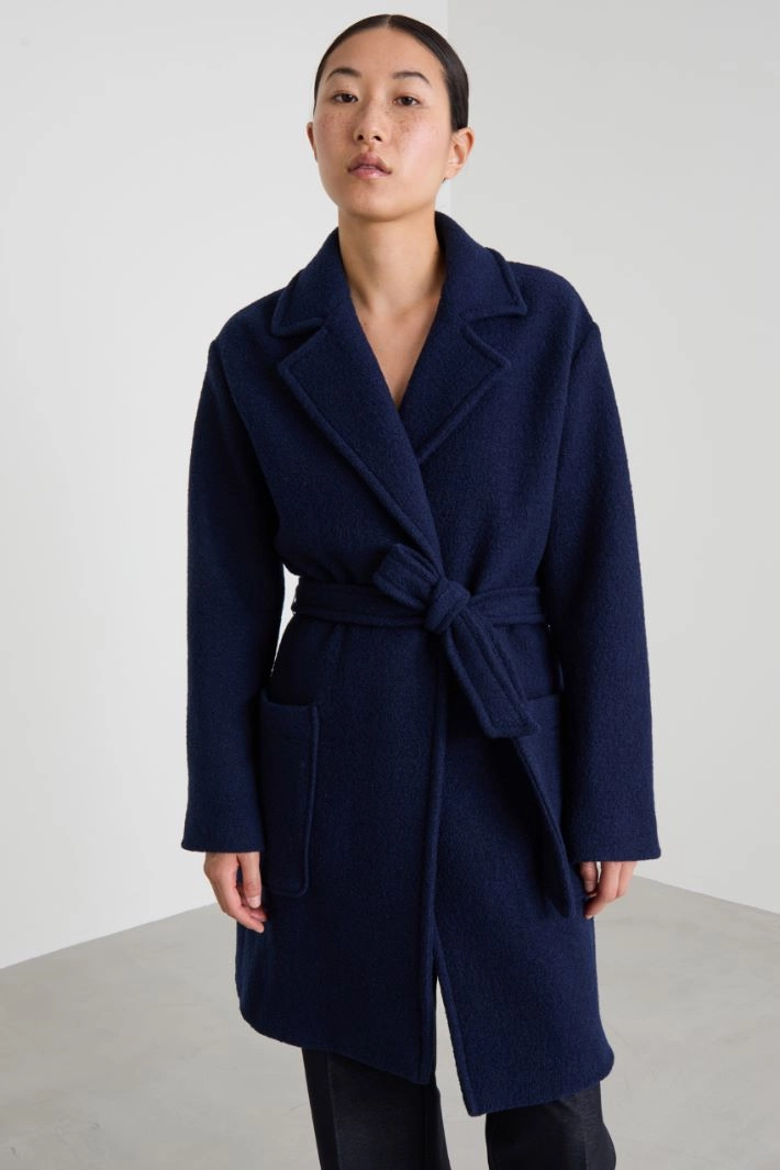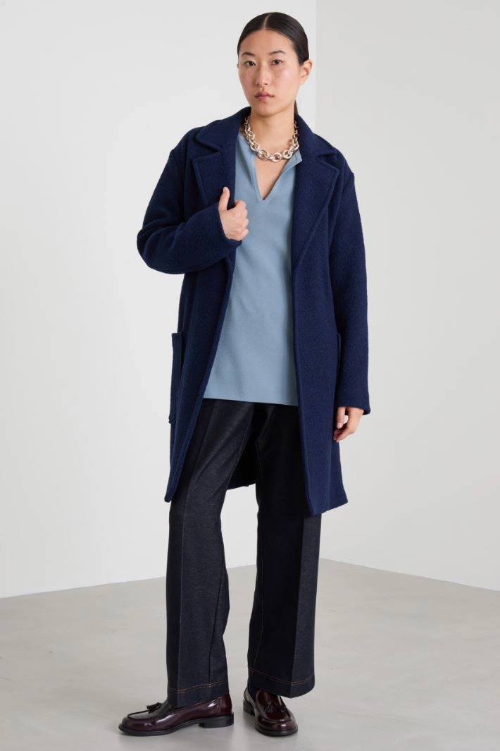 Straight-fit coat in pure boiled wool jersey, with lapel collar, long sleeves, side patch pockets and central slit on the back. Fastening with a matching belt. Unlined.