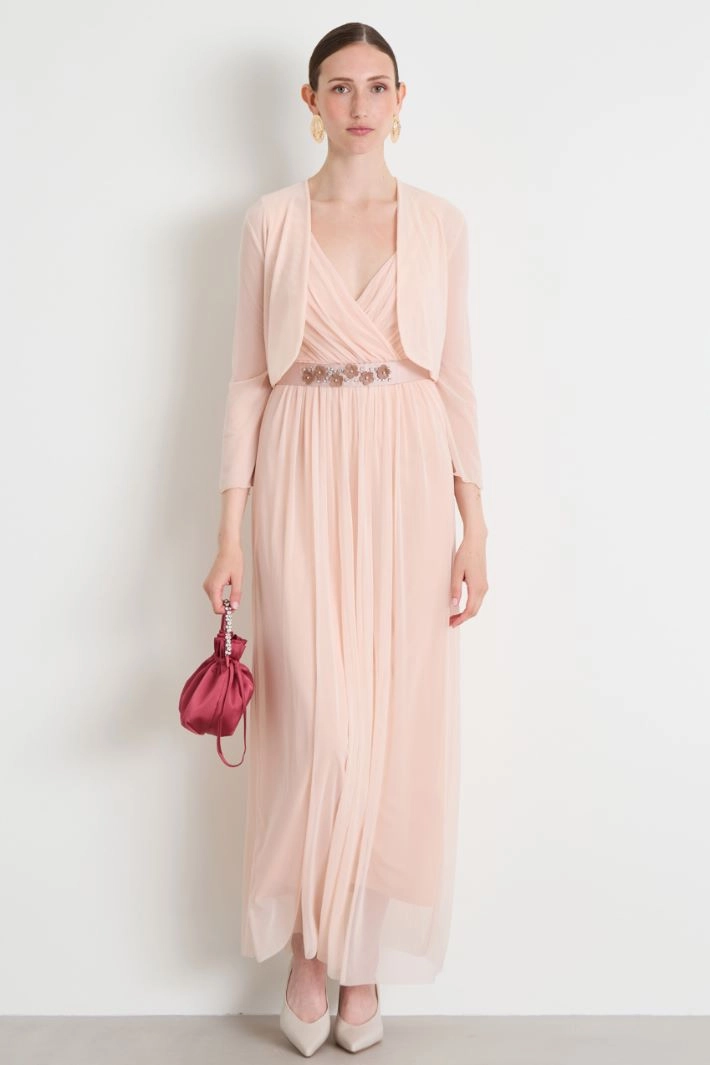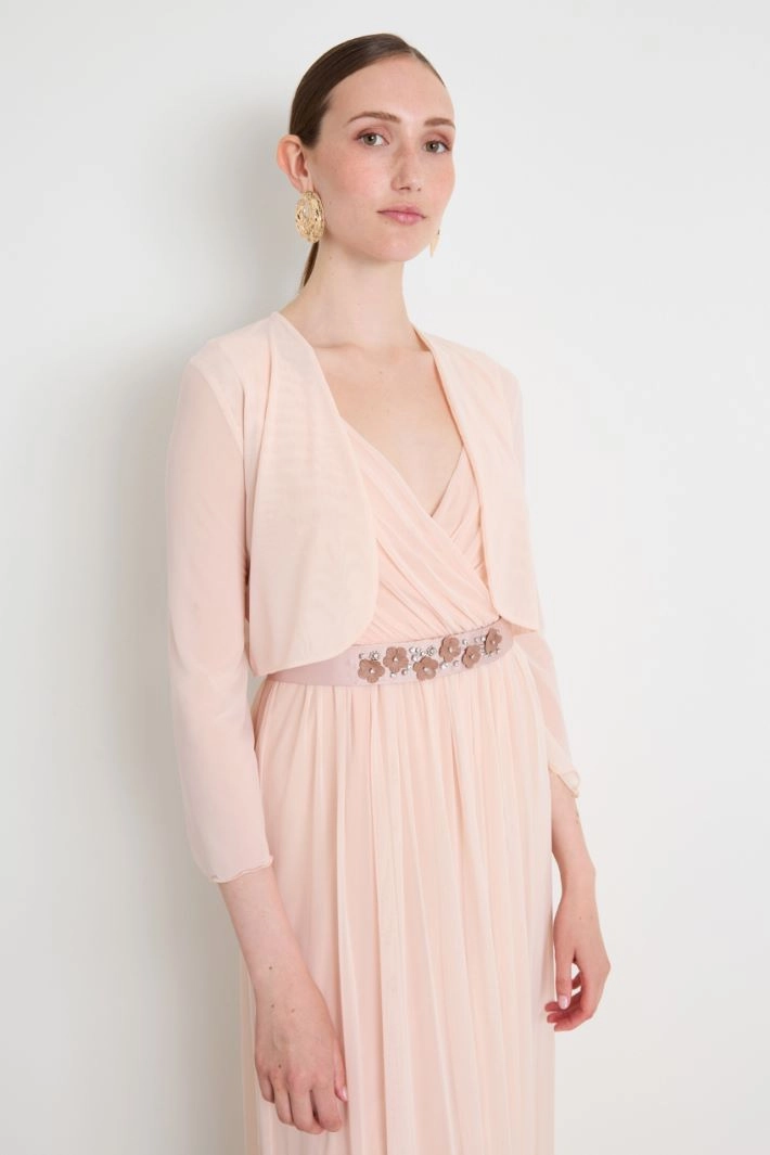 Straight-fit shrug in stretch tulle, with three-quarter sleeves. Without fastening.
