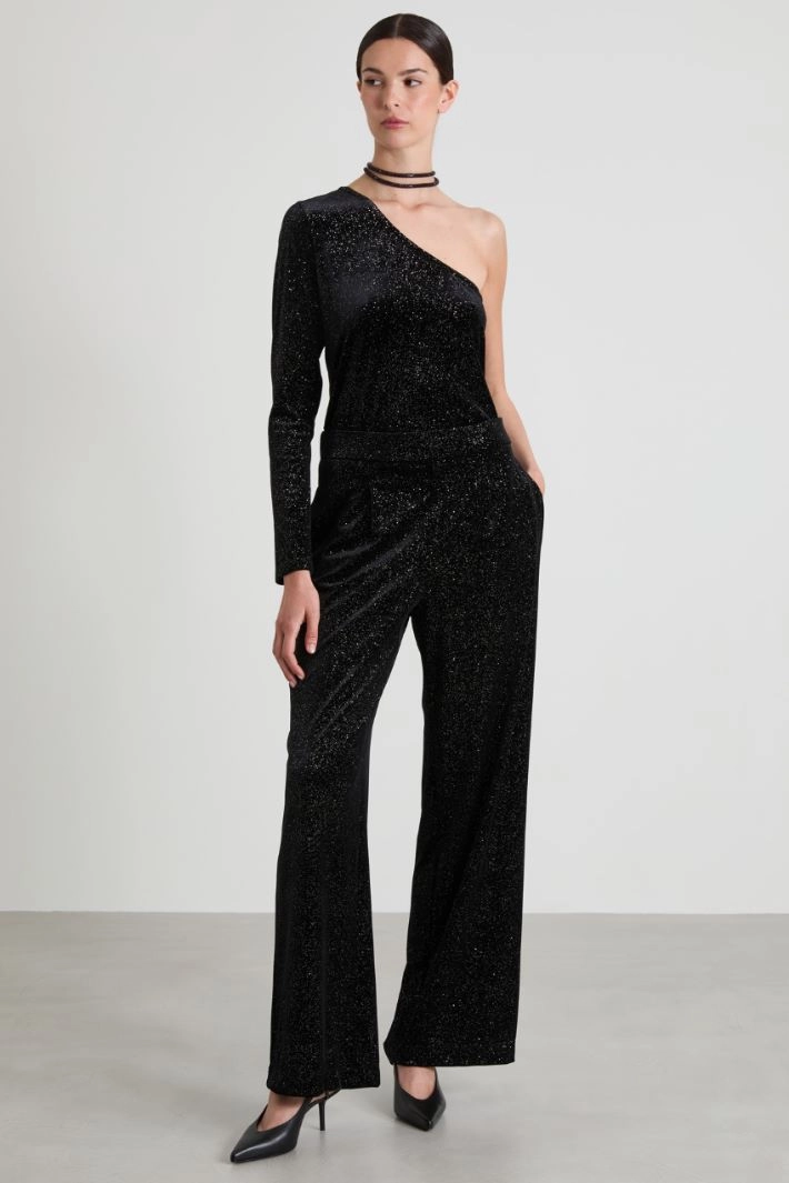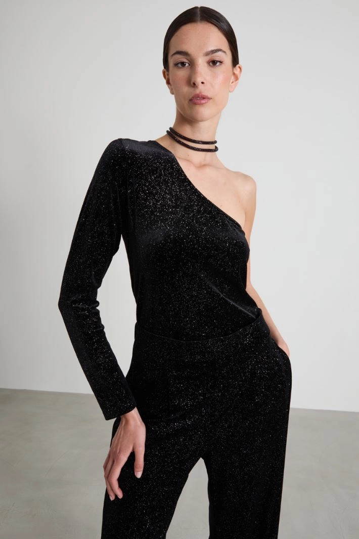 Fitted velvet jersey top with glitter and one-shoulder cut.