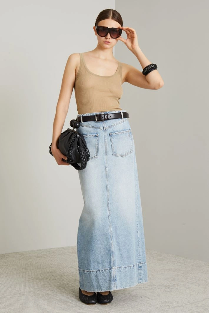 Long flared skirt in pure cotton denim, with belt loops at the waist, shaped yoke on the front, patch pockets and wide slit on the back. Fastening with hidden zip and hook on the back.