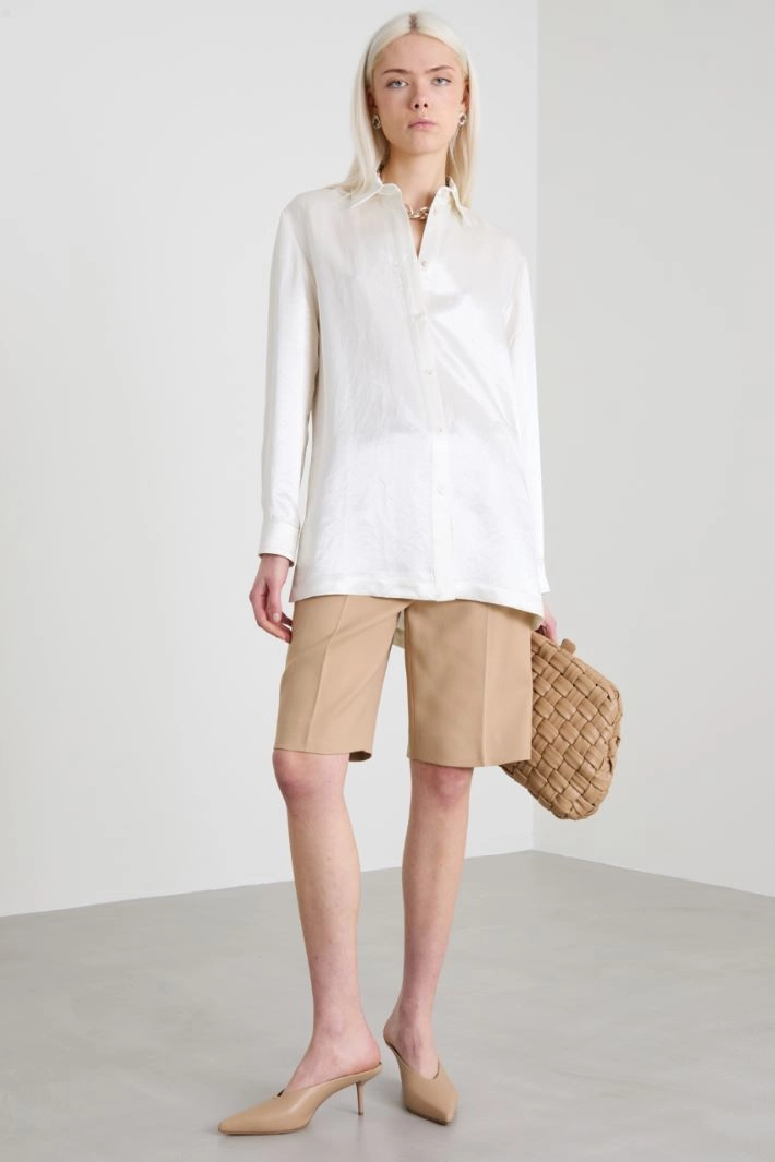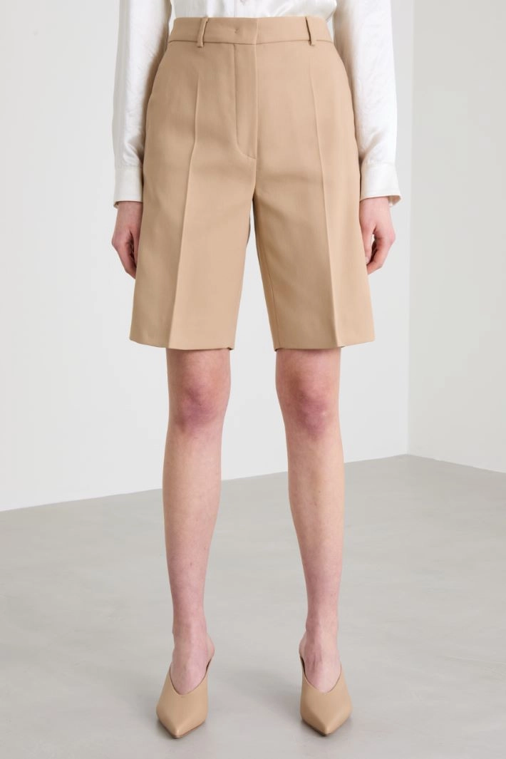 Bermuda shorts with a straight leg in double cotton and viscose canvas, with belt loops at the waist, side French pockets and double welt pockets on the back, crease pressed lengthwise and hidden fastening with zip, button and hook.