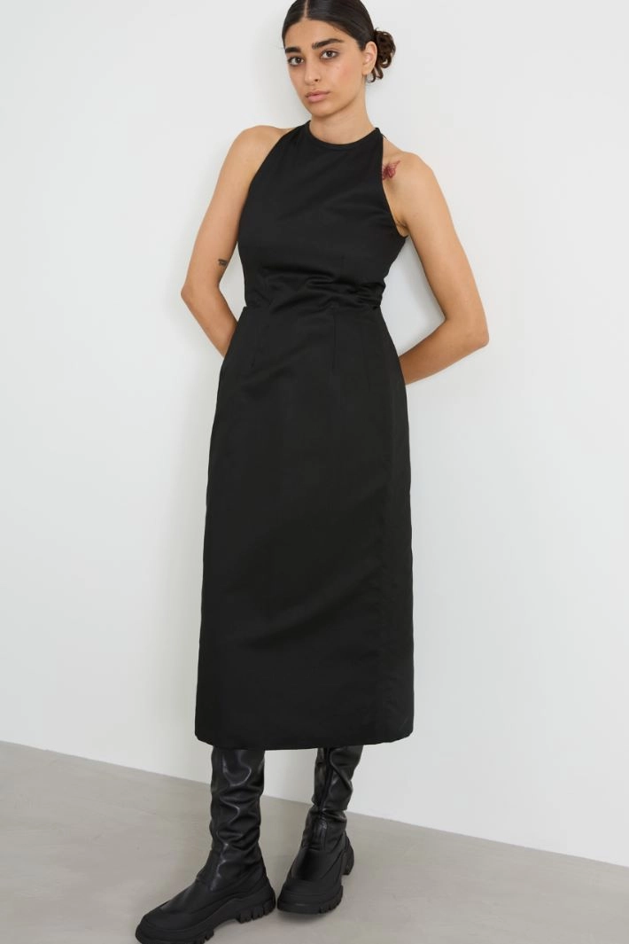 Fitted dress in cotton blend canvas, with round neckline, central slit on the back and skirt with internal gabardine insert that gives structure to the garment. Invisible zip fastening on the back. Lined.
