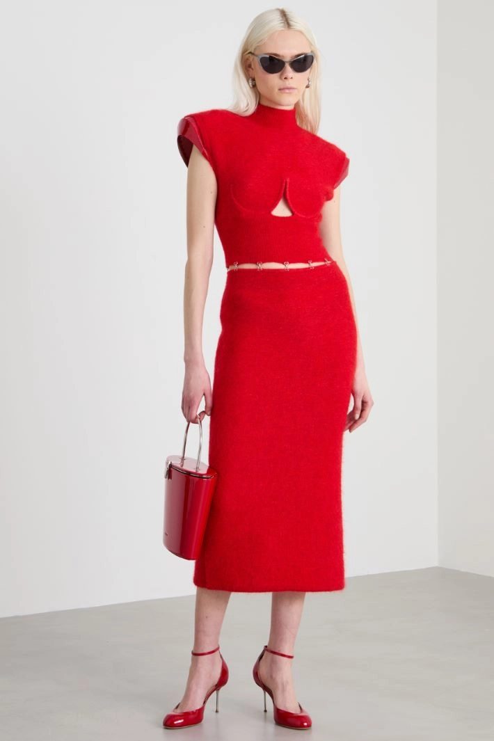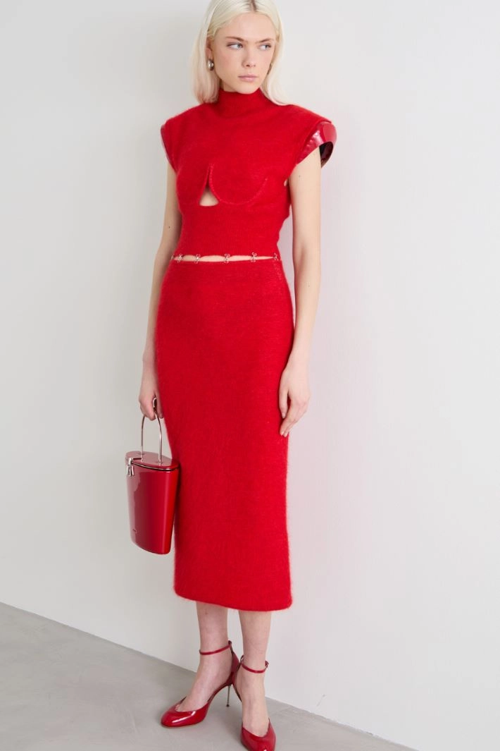 Fitted dress in blend of mohair and wool, with a high collar, lightly padded shoulders and a cropped waist with hooks.