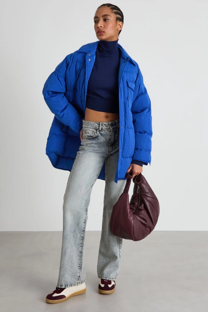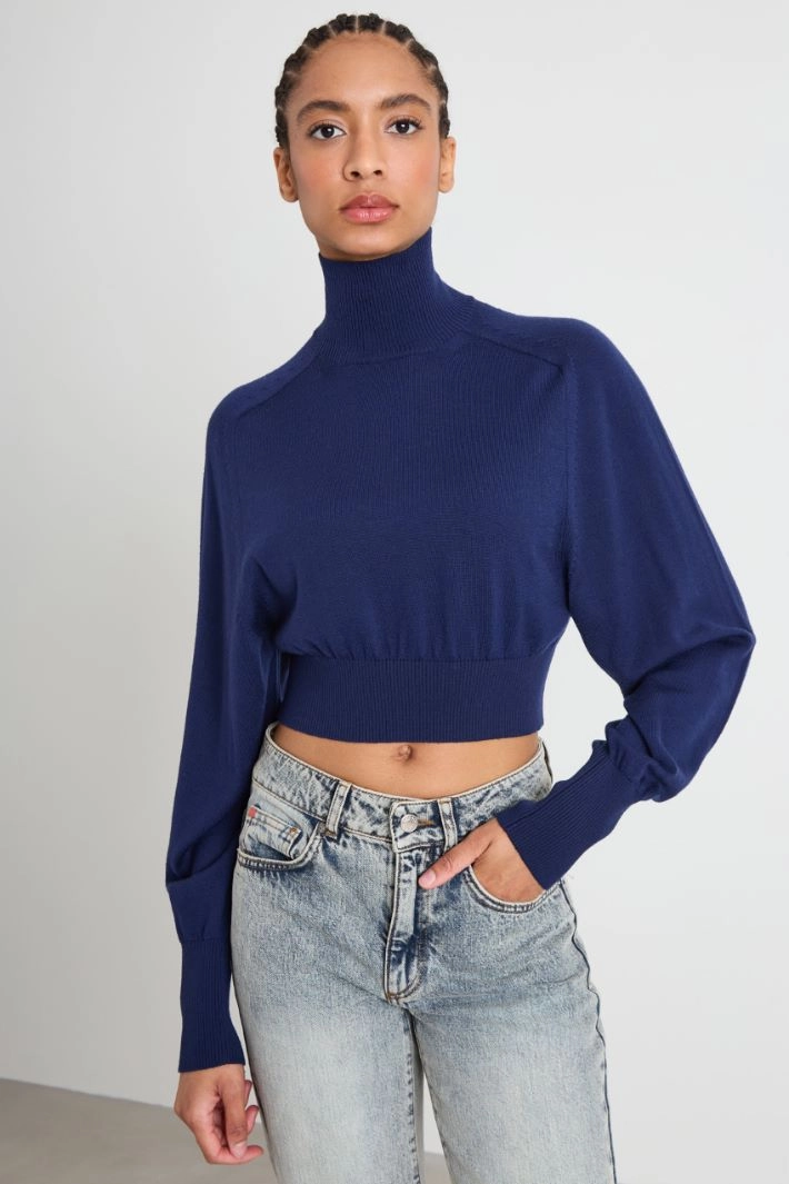 Cropped turtleneck with a narrow hem in wool yarn, featuring a high neck, puffed raglan sleeves with high cuffs and ribbed trims.