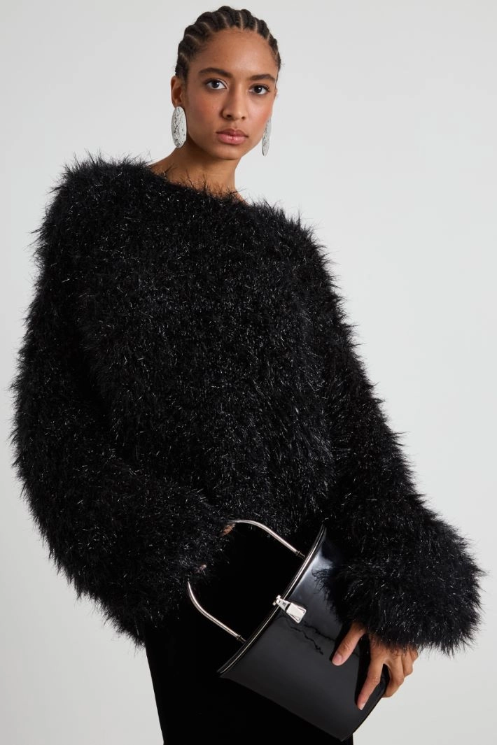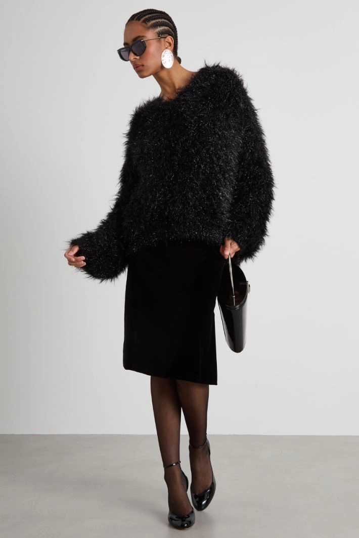Oversized sweater in fluffy-effect laminated yarn, with hood, V-neck, long sleeves and ribbed trim.