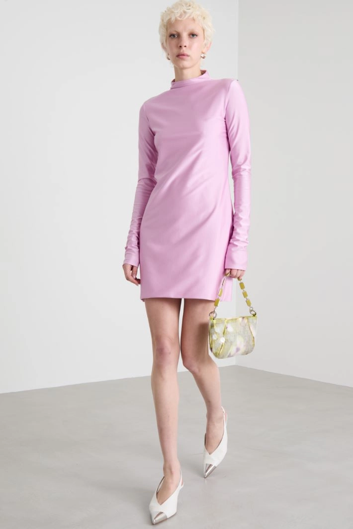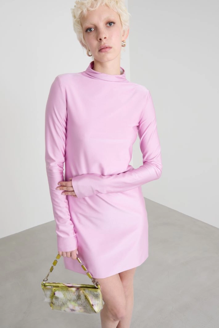 Fitted dress in stretch technical jersey, with high neck, long sleeves and invisible zip fastening on the back.