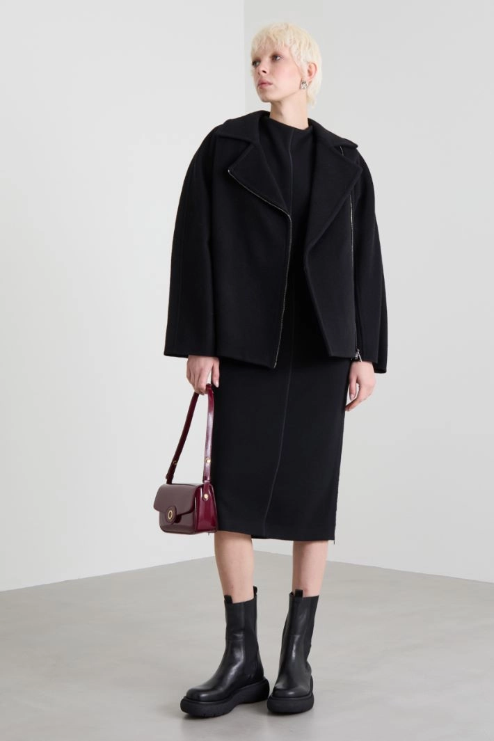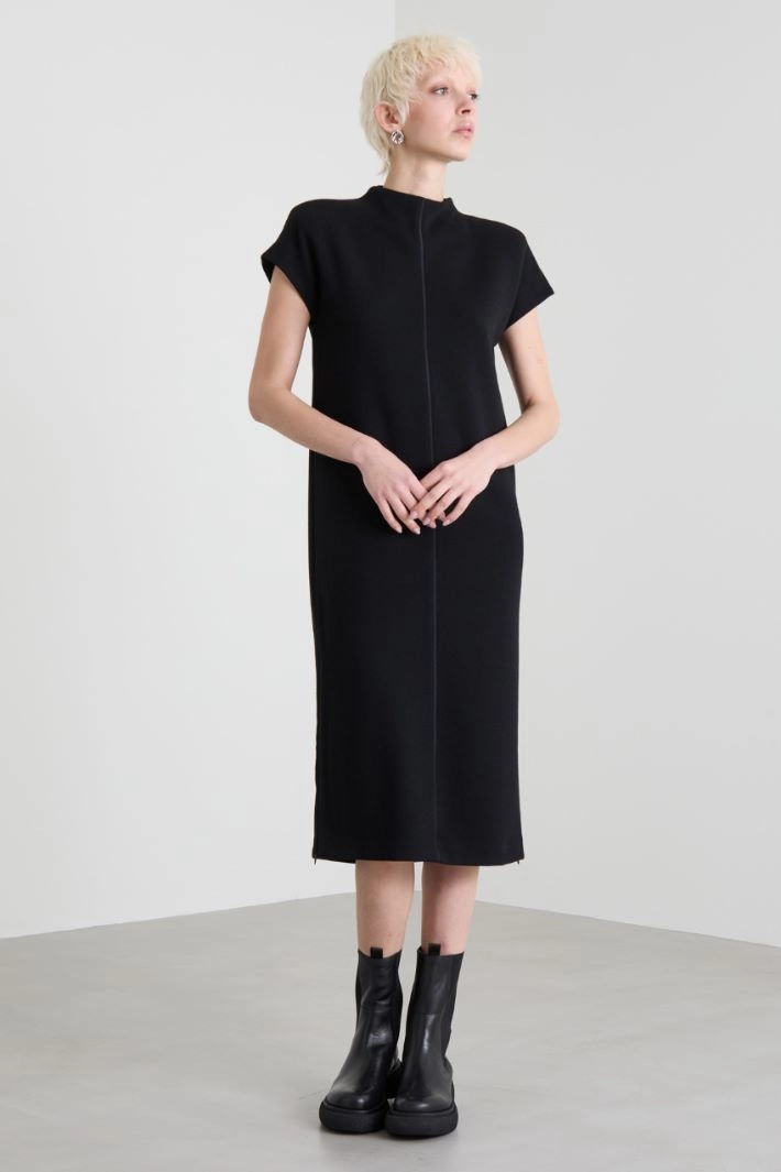 Straight-cut midi dress in double jersey of a stretch cotton and wool blend, with a crater neck, short kimono sleeves and adjustable side openings with zip. Invisible zip fastening on the back.