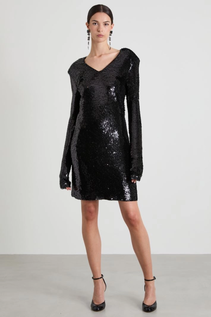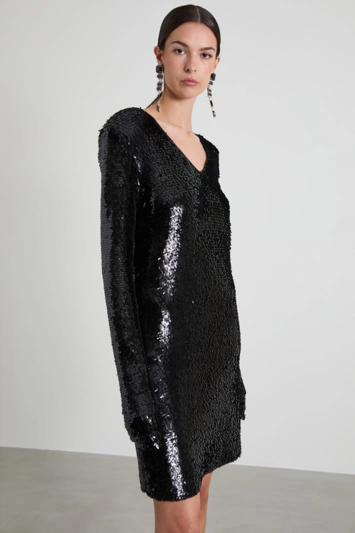 Semi-fitted jersey dress with all-over sequins, V-neck and long sleeves. Lined.
