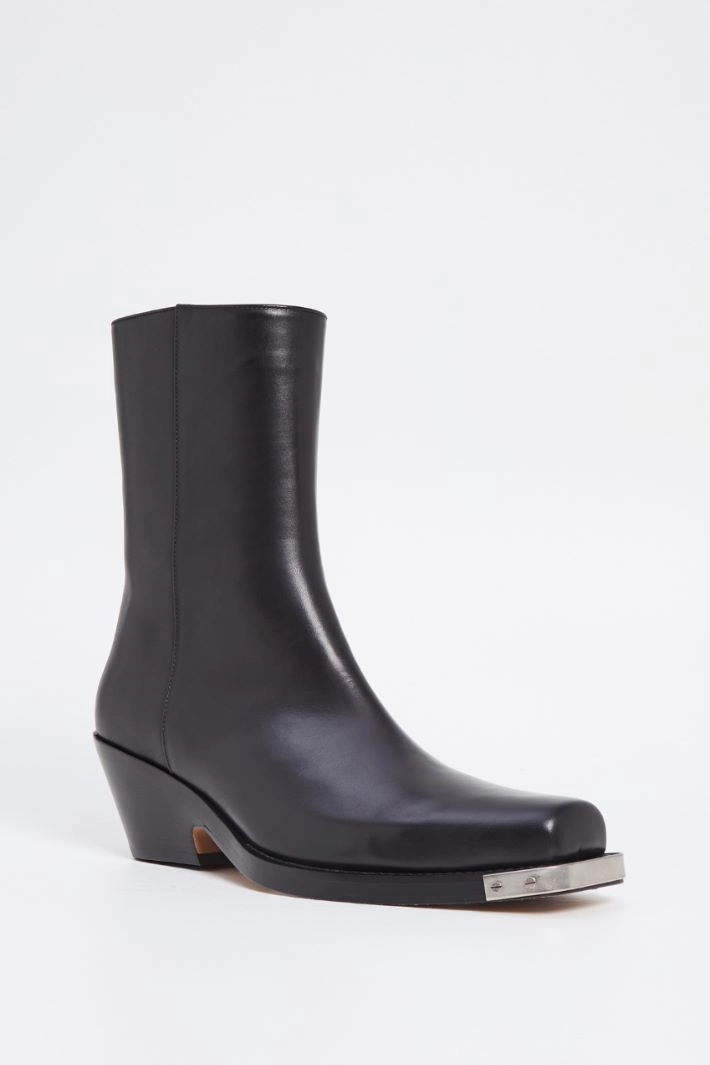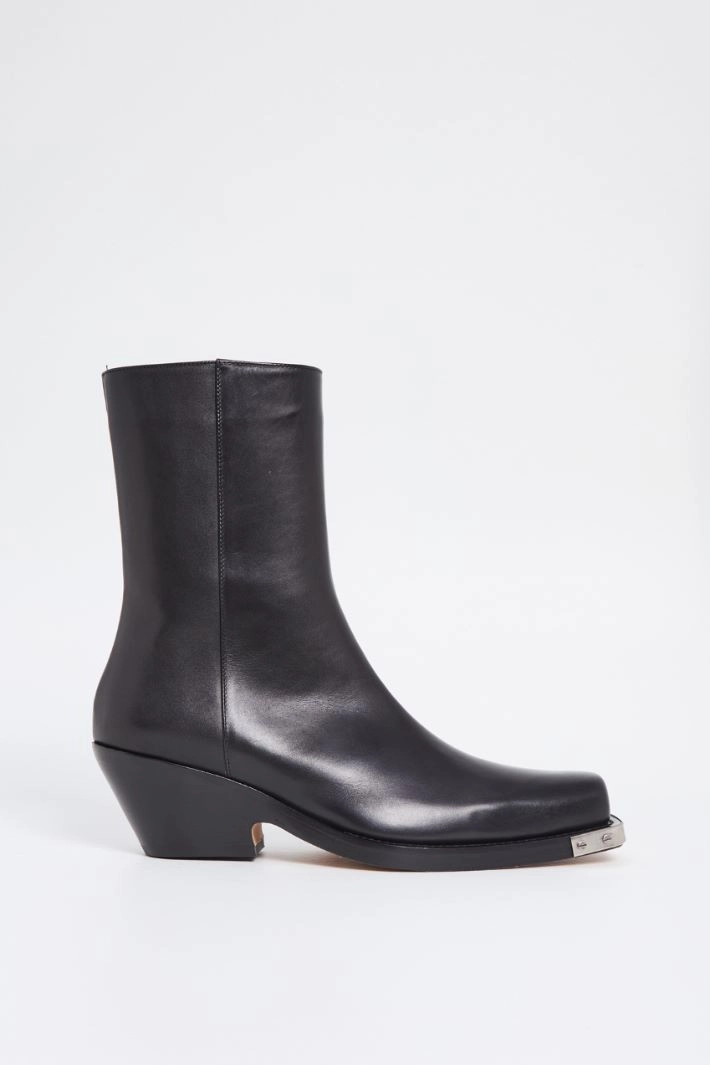 Cowboys boots in genuine leather with a shiny finish, square toe finished with metal detail and trapezoid heel. Zip fastening on the inside. Leather lining and leather sole.