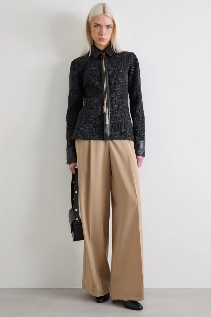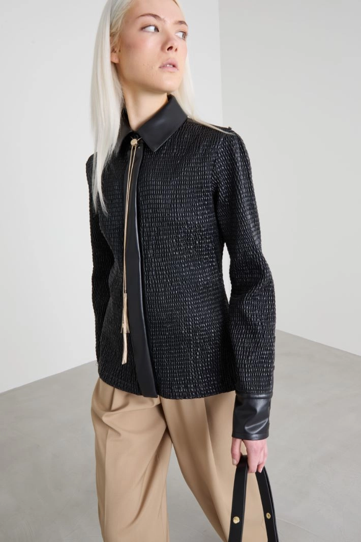 Slim-fit shirt in faux leather coated jersey with gathered elastic, classic collar, long sleeves with button placket, and yoke at the back. Concealed button fastening. Partially-lined.