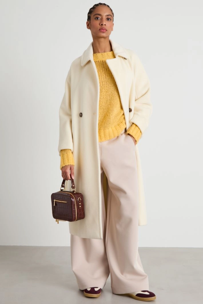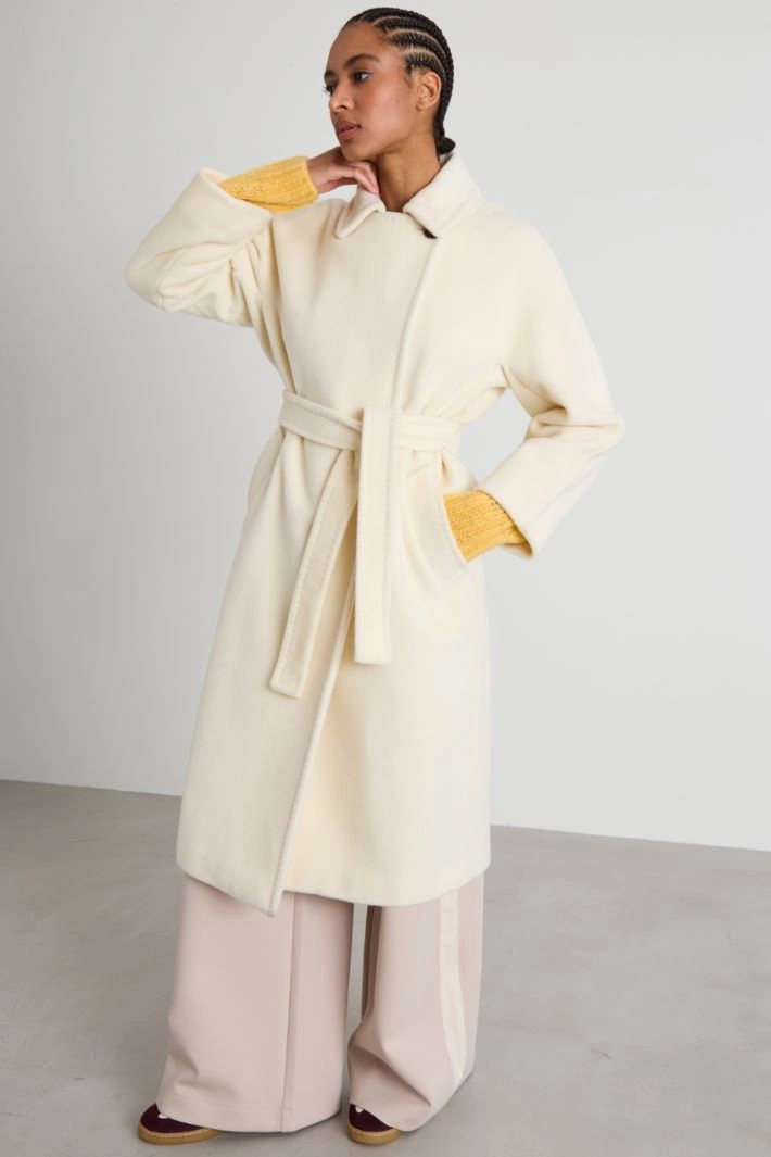 Straight-fit coat in pure wool beaver with a topstitched detail, lapel collar, long sleeves, welt pockets and a central vent on the back. Double-breasted fastening with buttons. Matching belt. Lined.