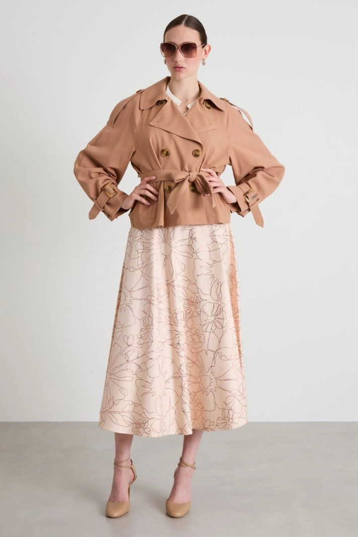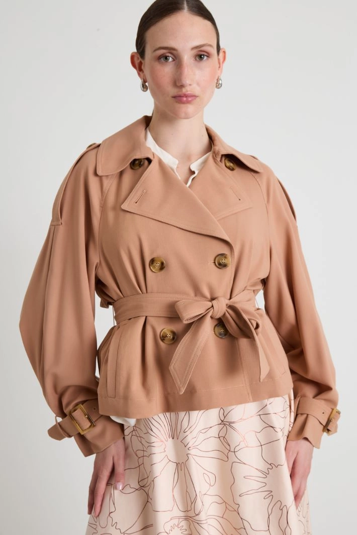 Straight-cut trench coat in water-repellent wool-blend gabardine, with lapel collar, long raglan sleeves with toggles on the shoulders and cuffs, welt pockets and a matching belt. Double-breasted button fastening.