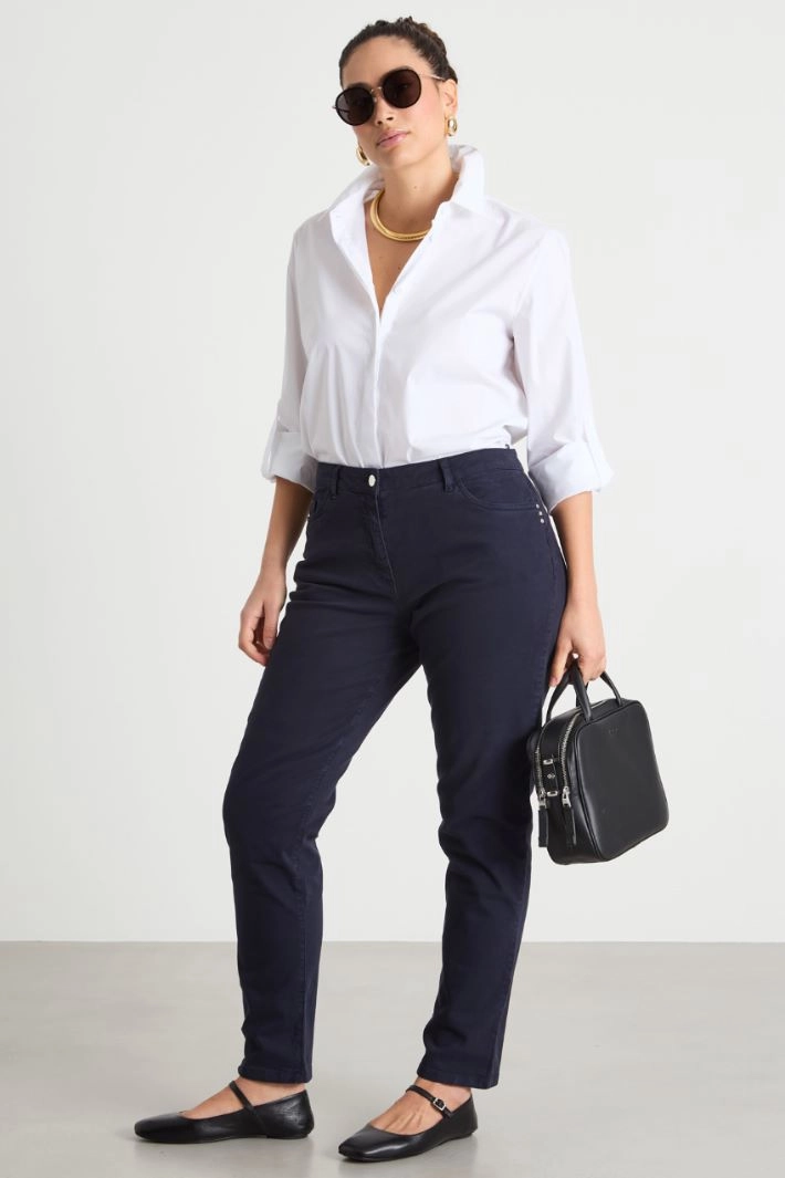 Straight-cut shirt in stretch cotton poplin, with a point collar and long sleeves with tab details. Button fastening.