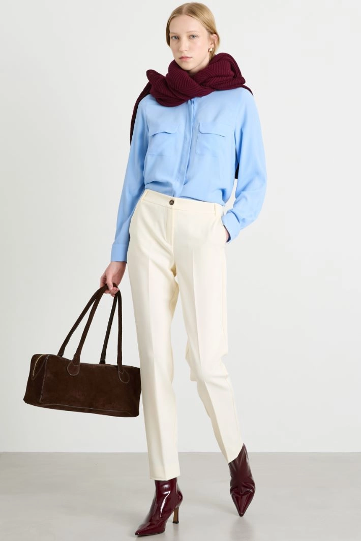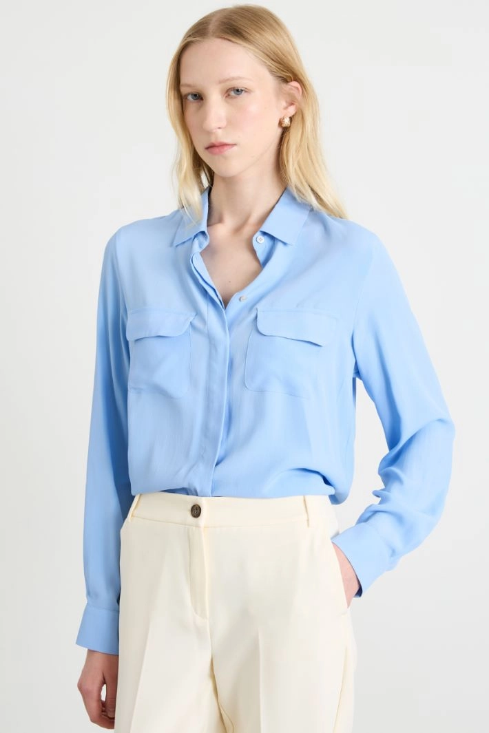 Flowing shirt in silk blend crepe de chine, with shirt collar, long sleeves with cuff and button, and chest pockets with flap. Yoke cut with box pleat on the back and hidden button fastening.