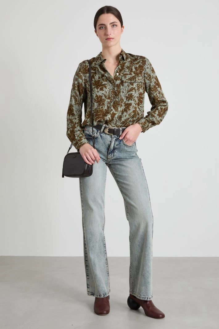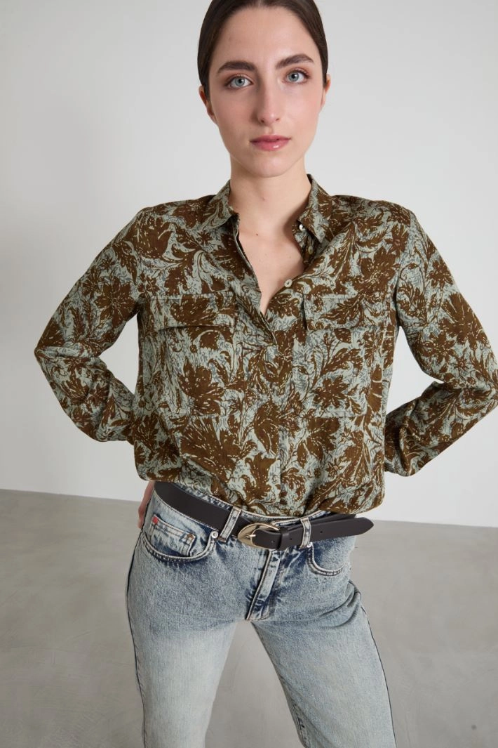 Flowing straight-fit shirt in printed twill, with classic collar, long sleeves with buttoned cuff, patch pockets with flap on the front and yoke with box pleat on the back. Concealed button fastening.