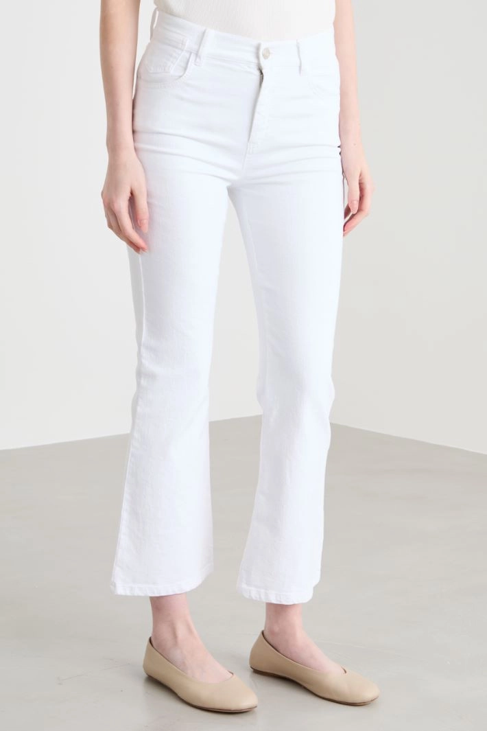 Slim-fit trousers in stretch cotton bull denim, featuring belt loops, front scoop pockets and patch pockets on the back, and a button and concealed zip fastening.