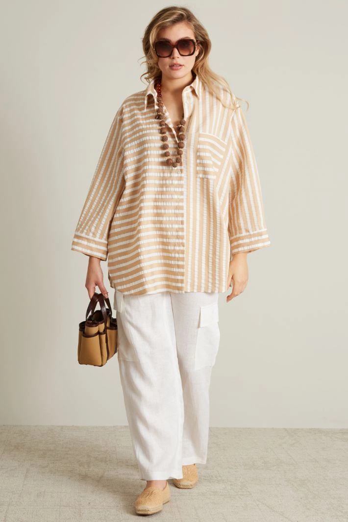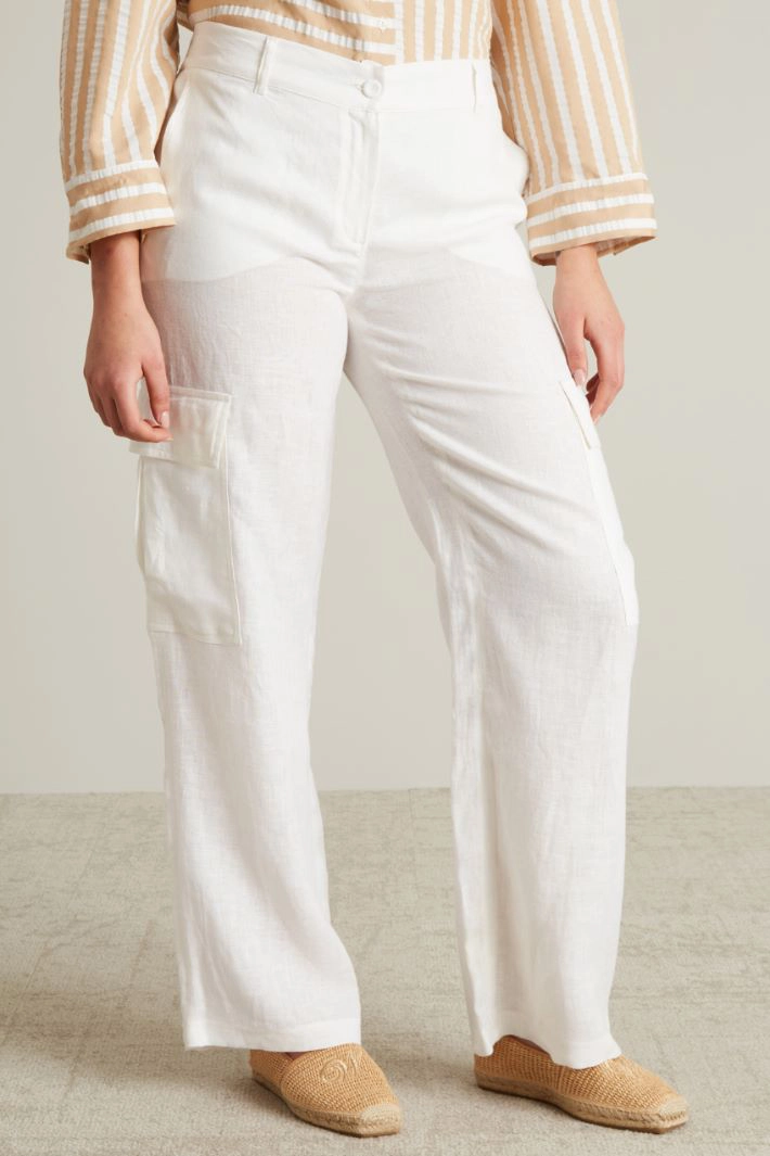 Linen cargo trousers with elastic waistband, belt loops, French pockets, patch pockets on the back and sides. Fastening with button and zip.