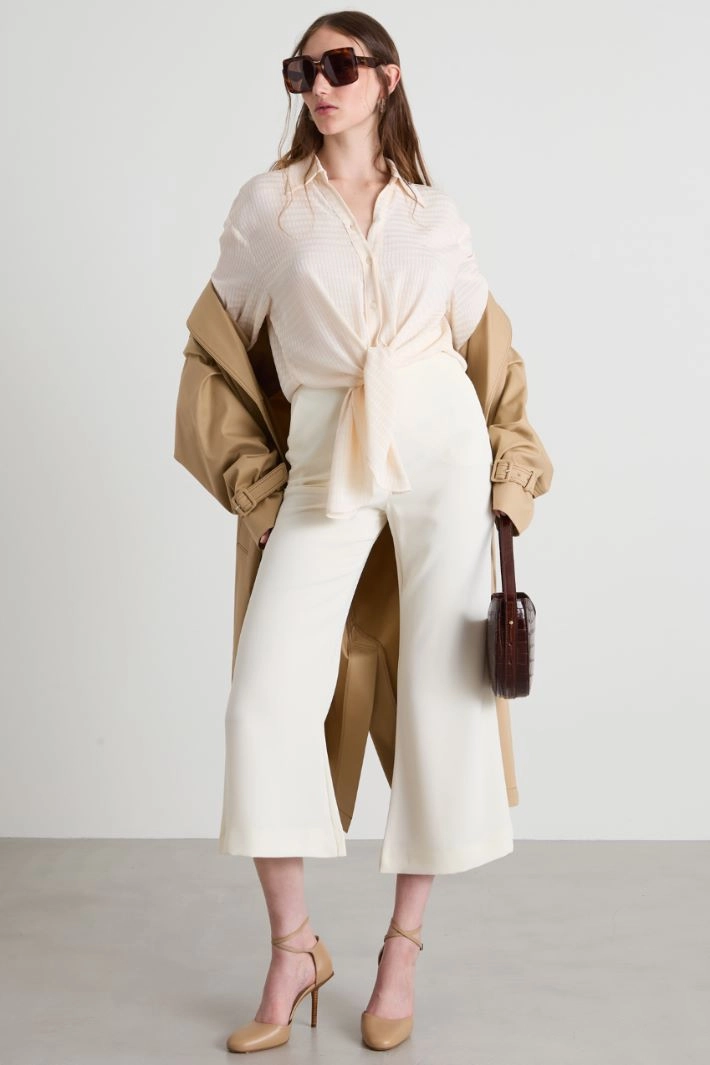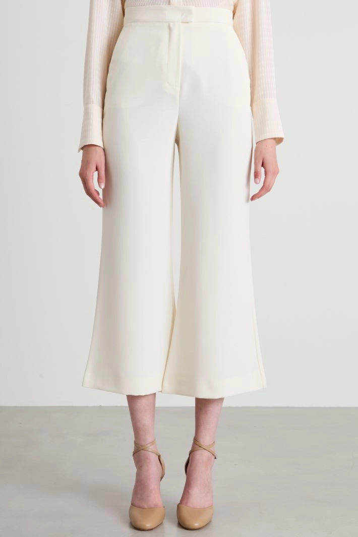 Flare trousers in crepe envers satin, with French side pockets and rear welt pockets. Fastening with asymmetrical fly with hidden zip, button and hook.