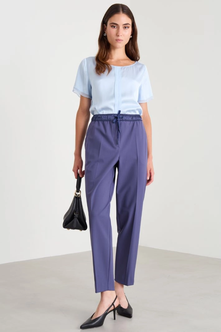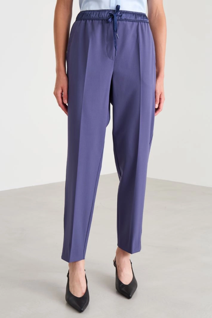 Slim-fit trousers in stretch canvas fabric, elasticated waist with drawstring, side French pockets and rear welt pockets, pressed crease Lace-up fastening.