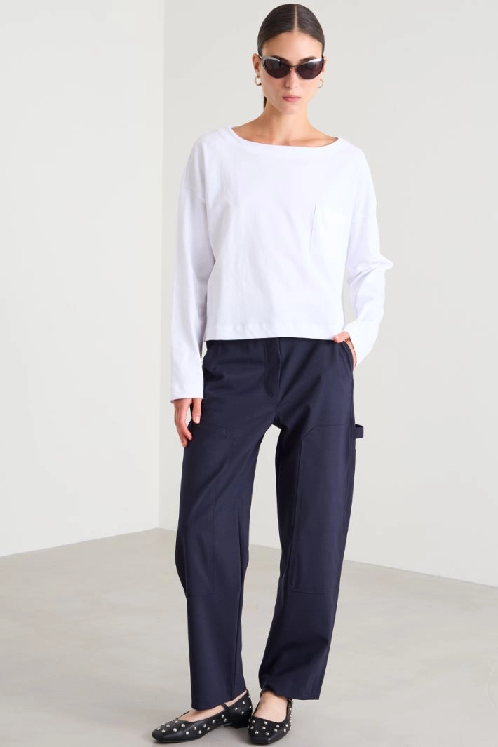 Straight-fit trousers in stretch wool blend canvas, with belt loops at the waist, side French pockets and patch pockets on the back and along the leg, and fastening with a hidden zip and button.