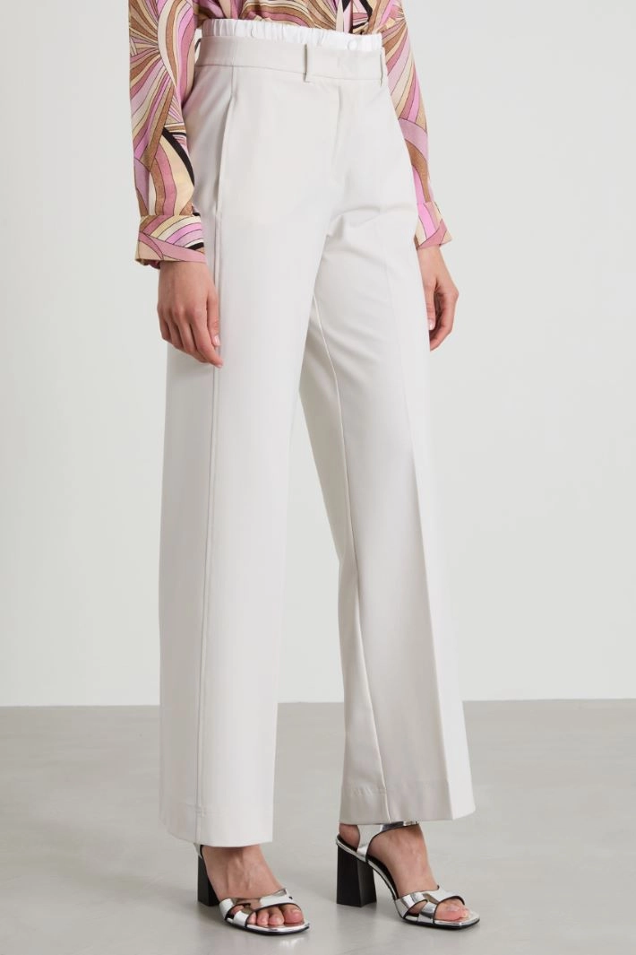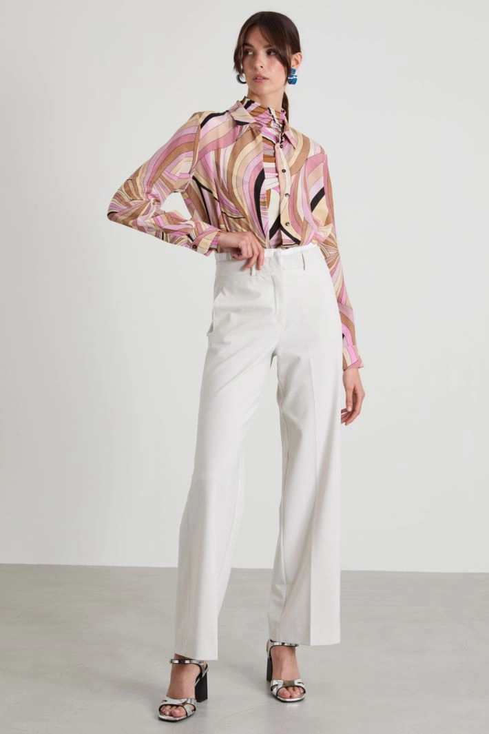 Straight-fit trousers in flowing fabric, with elastic satin detail and belt loops at the waist, French pockets at the front, welt pockets at the back and crease pressed along the length. Zip, hook and button fastening.
