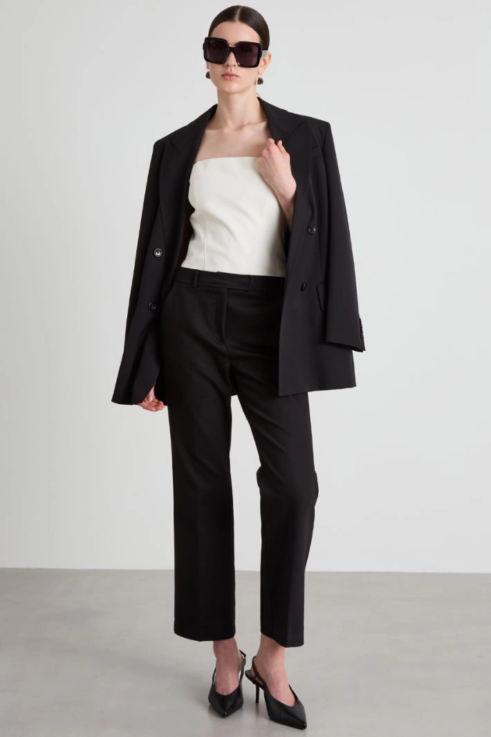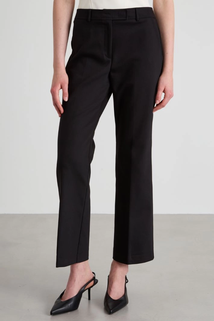 Flare trousers in stretch cotton blend, belt loops, French and welt pockets on the back, pressed crease lengthwise on both sides. Concealed hook and zip fastening.