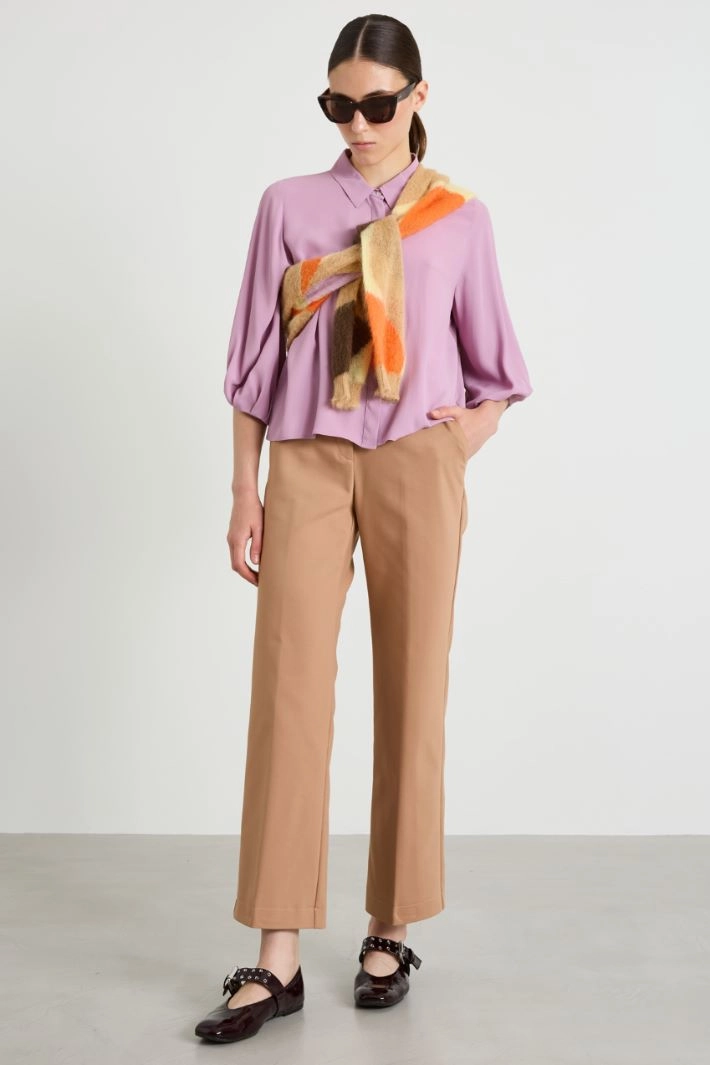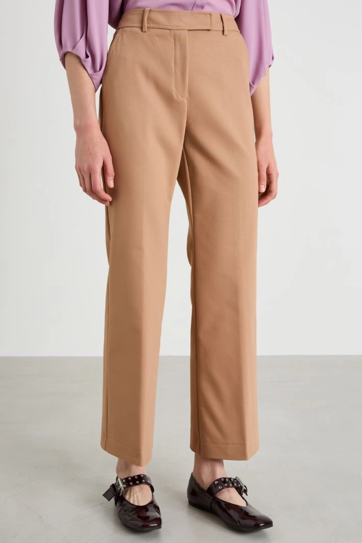 Flare trousers in stretch cotton blend, belt loops, French and welt pockets on the back, pressed crease lengthwise on both sides. Concealed hook and zip fastening.