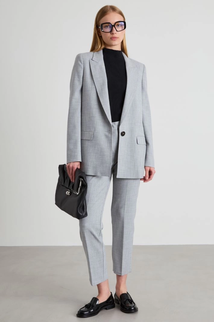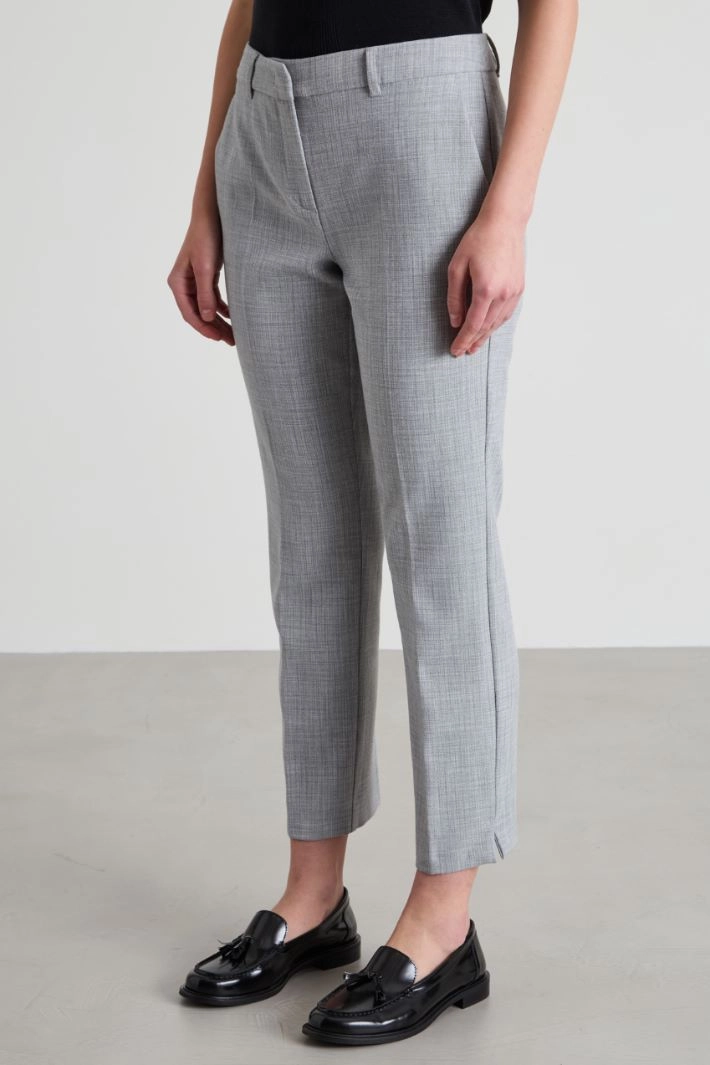 Cigarette trousers in viscose blend basketweave, with belt loops at the waist, French pockets in the front, welt pockets at the back and crease ironed lengthwise. Hidden fastening with zip, button and hook.