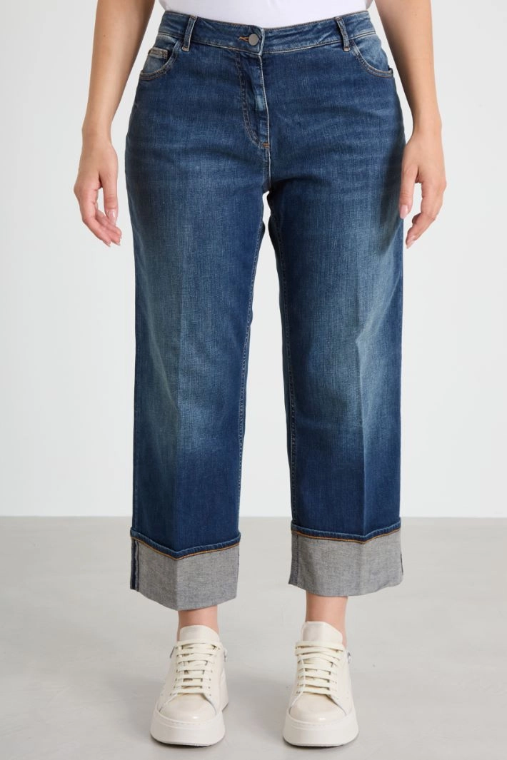 Straight jeans in stretch cotton denim, with belt loops, five pockets, rolled hem and concealed zip and button fastening.