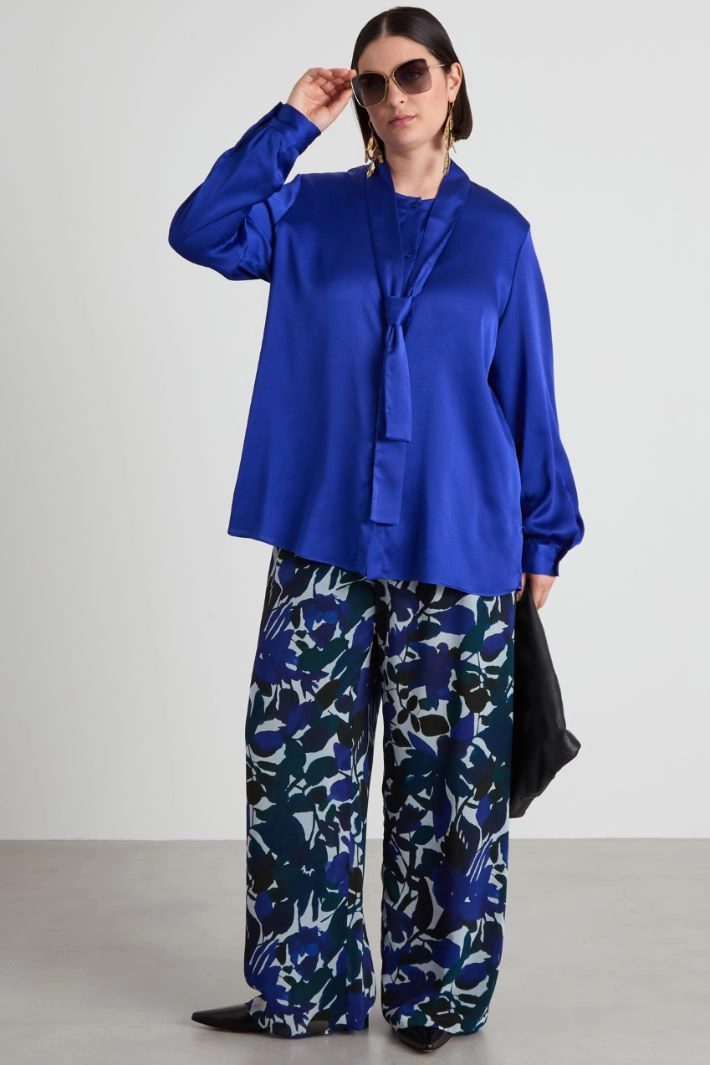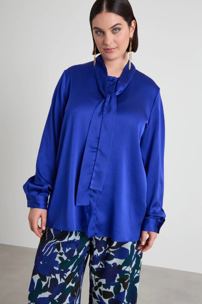 Straight-cut blouse in hammered satin, with round neckline, long sleeves with buttoned cuffs, and a matching removable scarf. Button fastening.