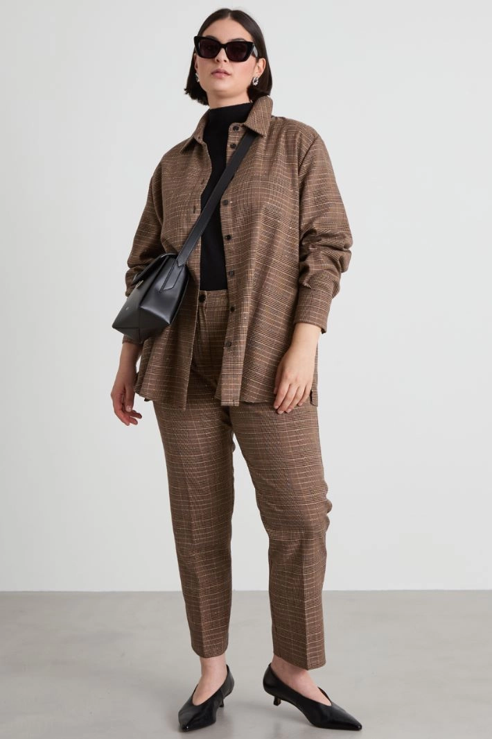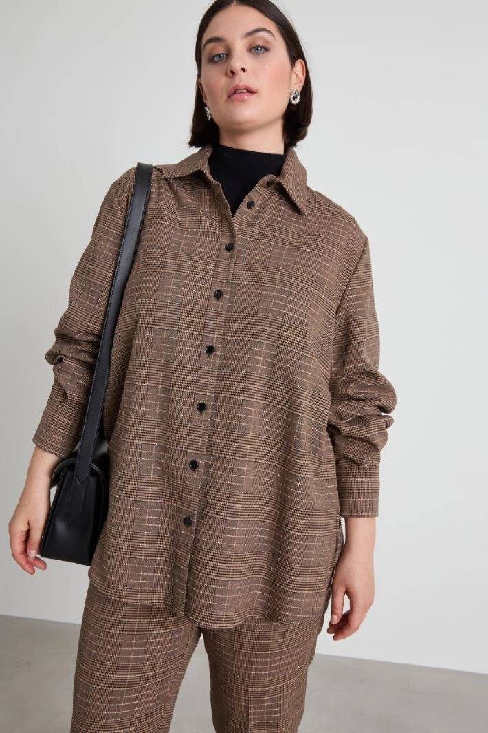 Straight-cut tunic in stretch viscose blend yarn-dyed fabric, with tone-on-tone embroidered micro sequins, shirt collar, long sleeves with cuff and button, and side slits. Fastening with visible buttons.