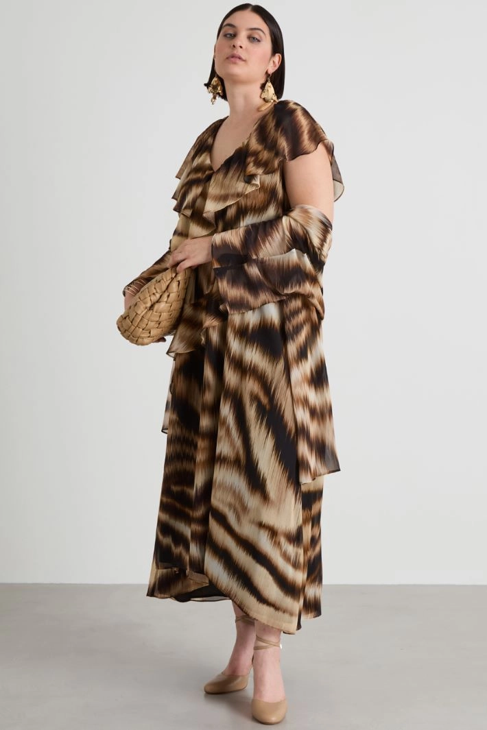 Loose-fitting dress in georgette with asymmetrical ruffles details on the front, V-neck, cap sleeves and a slit on the front. Invisible zip fastening on the back. Lined.