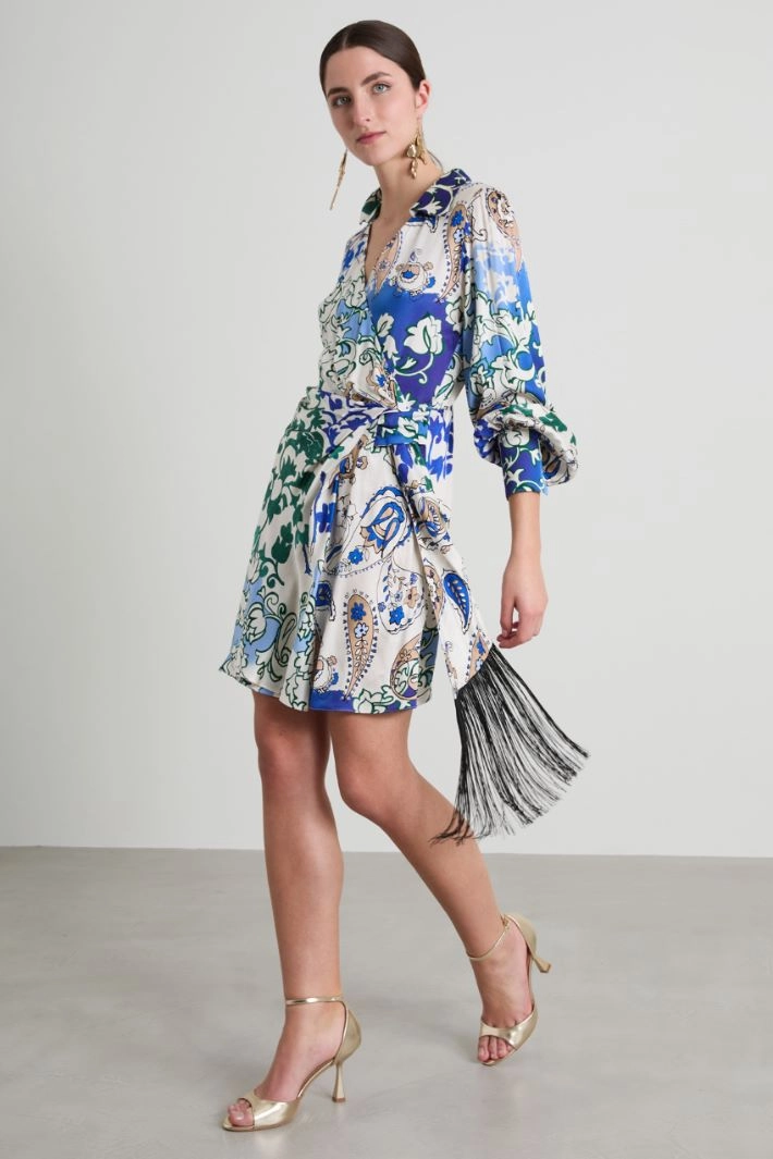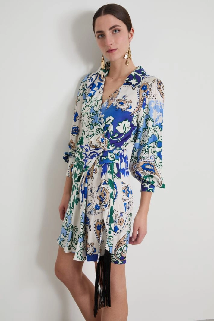 Fitted dress in all-over printed viscose satin, with shirt collar, crossed V-neck, long sleeves with high cuff and button, and hidden elastic insert at the waist. Knot fastening on the side with fringes at the bottom.